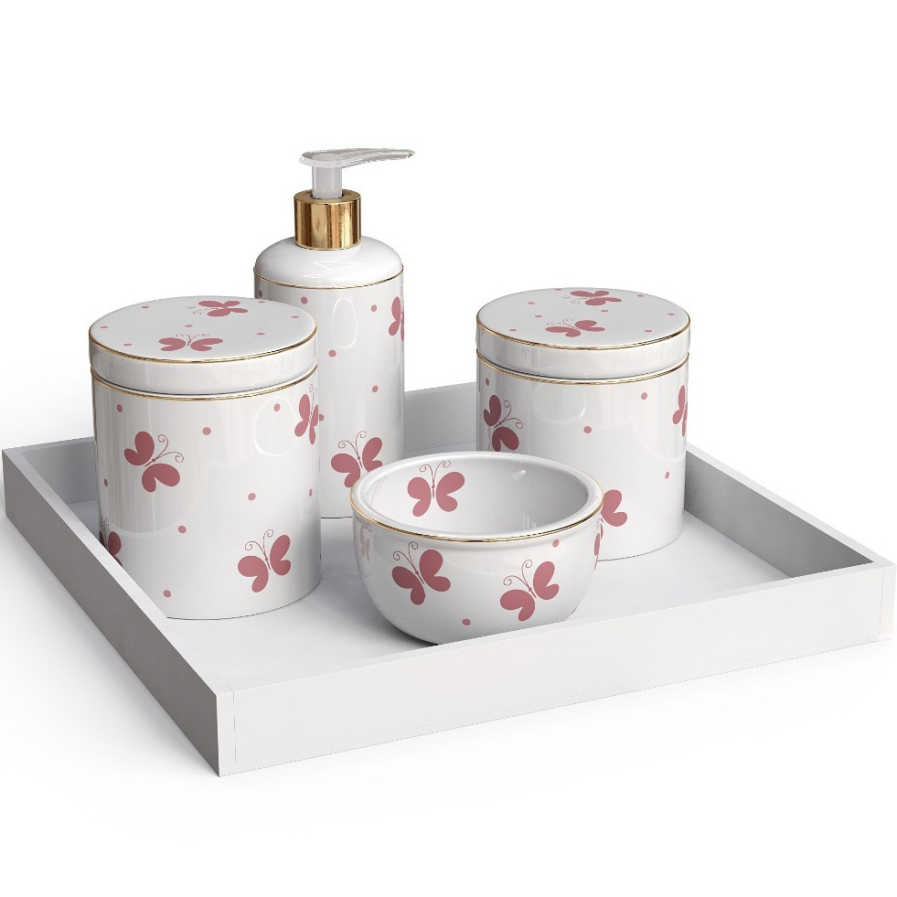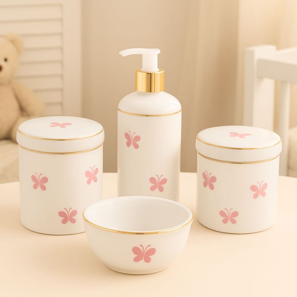 Kit Higiene Bebe Porcelana Borboletas Filete De Ouro Delicado