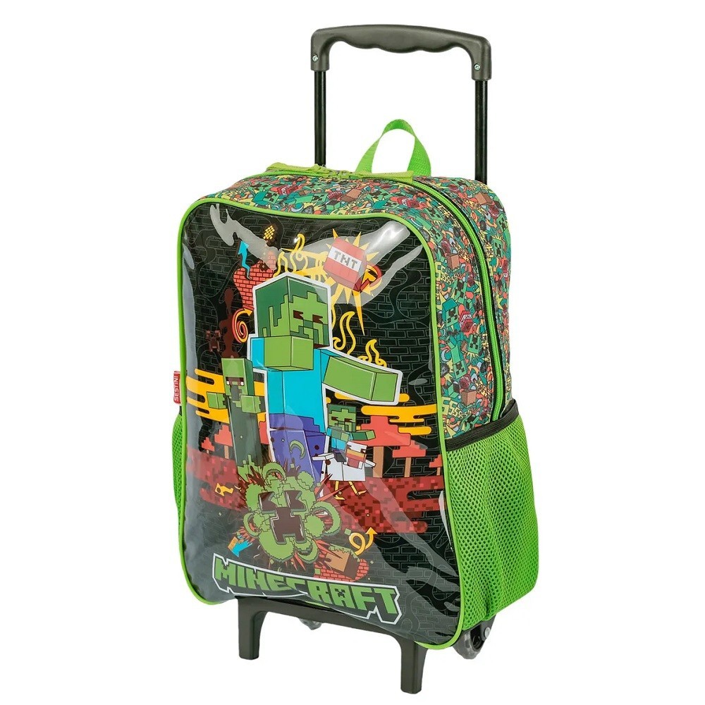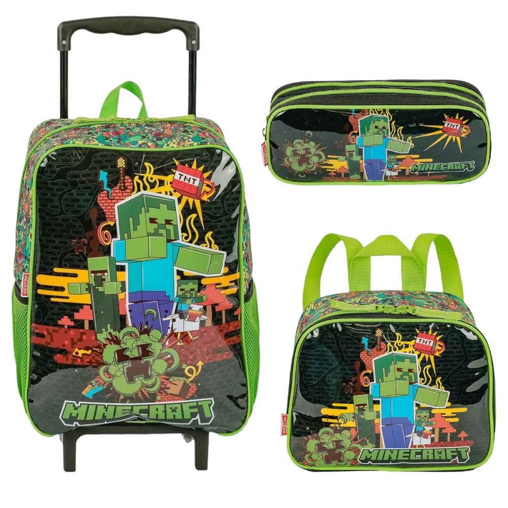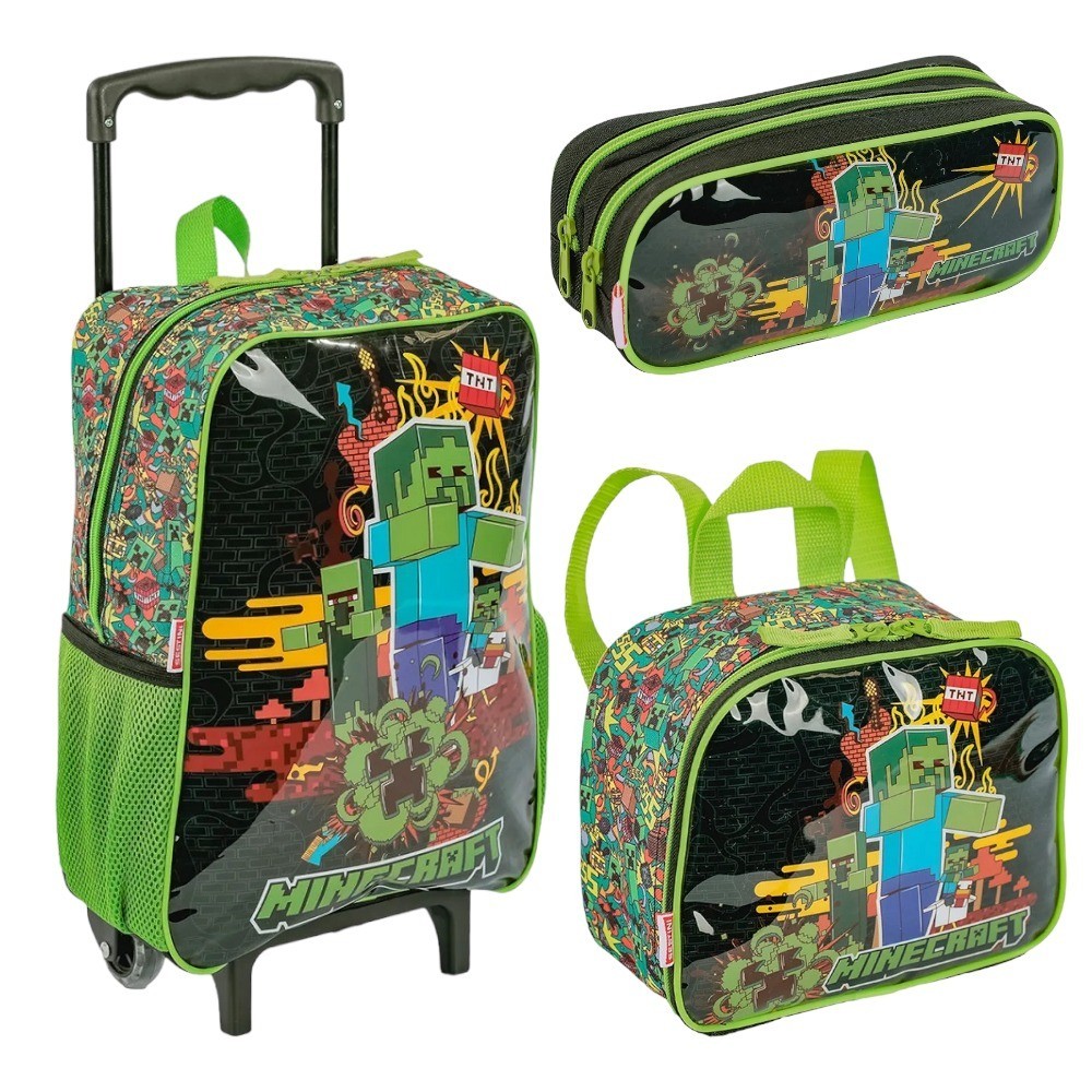 Kit Infantil Minecraft Fun Mochila Rodinhas Estojo Lancheira