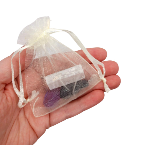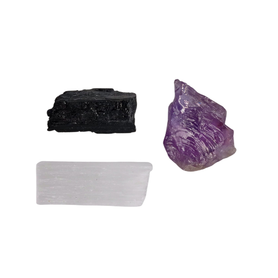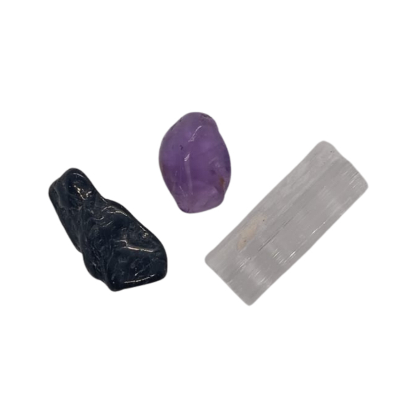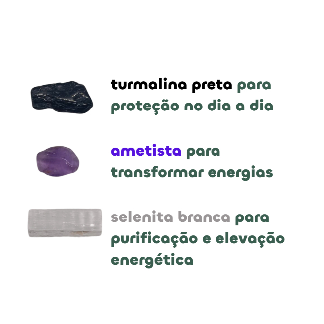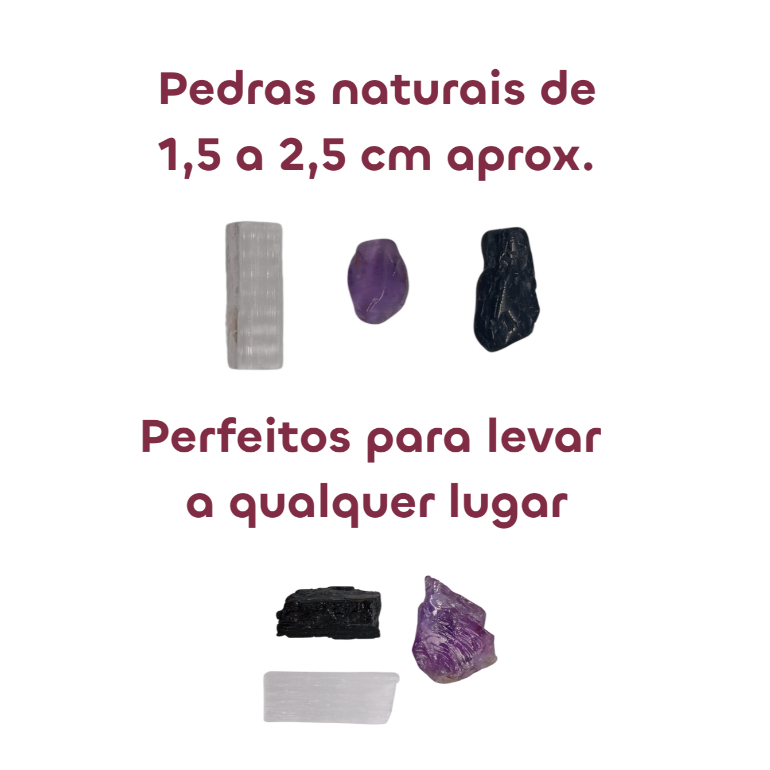 Kit Iniciantes Turmalina Ametista Selenita Pedra Natural Bruta Rolada com 3 Cristais e Informativo