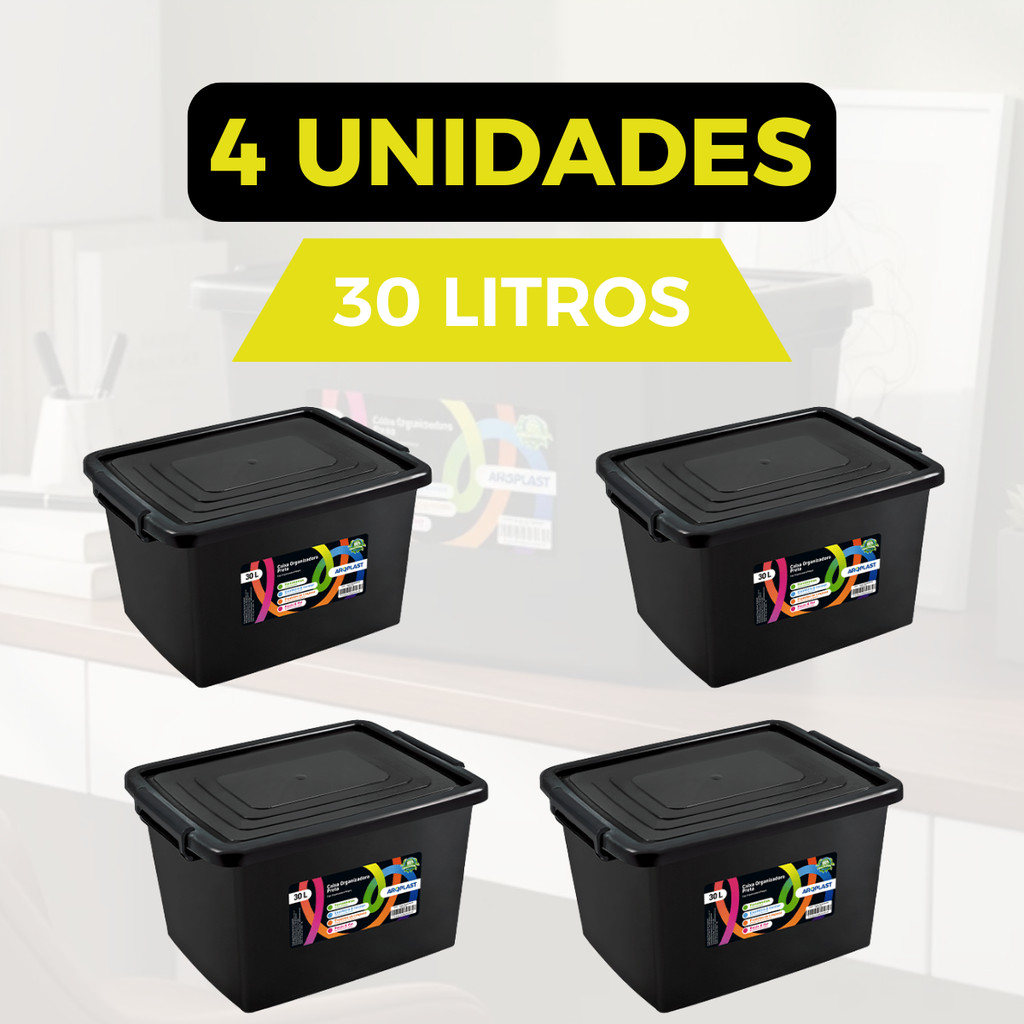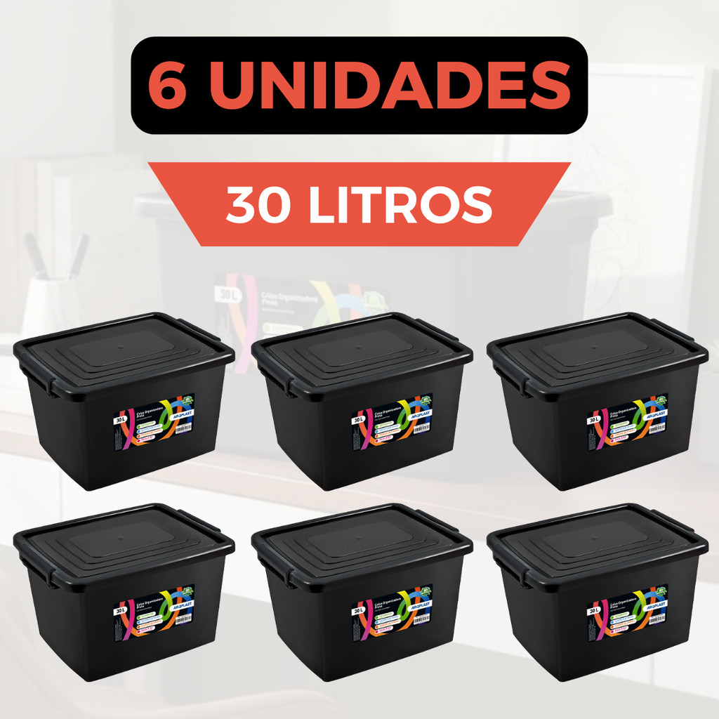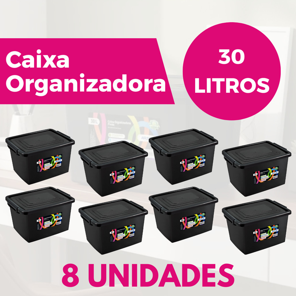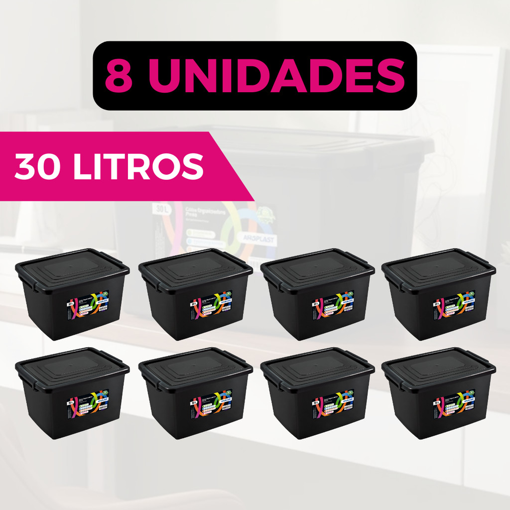 Kit Jogo 8 Caixas Organizadoras 30 Litros Com Tampa E Travas Preta Para Organização Armazenar