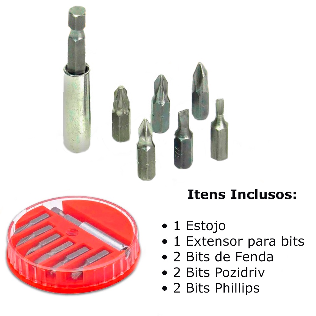 Kit Jogo Bits Fenda Philips Pozidriv Parafusadeira Furadeira Com Adaptador 7 Peças Profissional