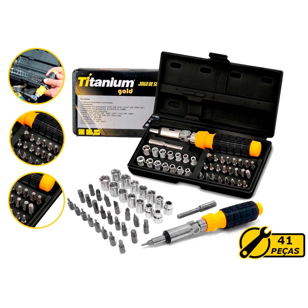 Kit Jogo De Soquetes Sextavados Bits Chave Articulada Encaixe 1/4Pol. 41 Peças -TITANIUM