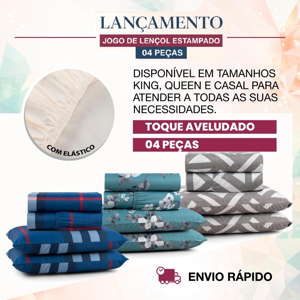 Kit Jogo Lençol Cama Box Casal, Queen, King Percal 400 Fios Estampado 04 Pçs Ponto Palito C/Elástico