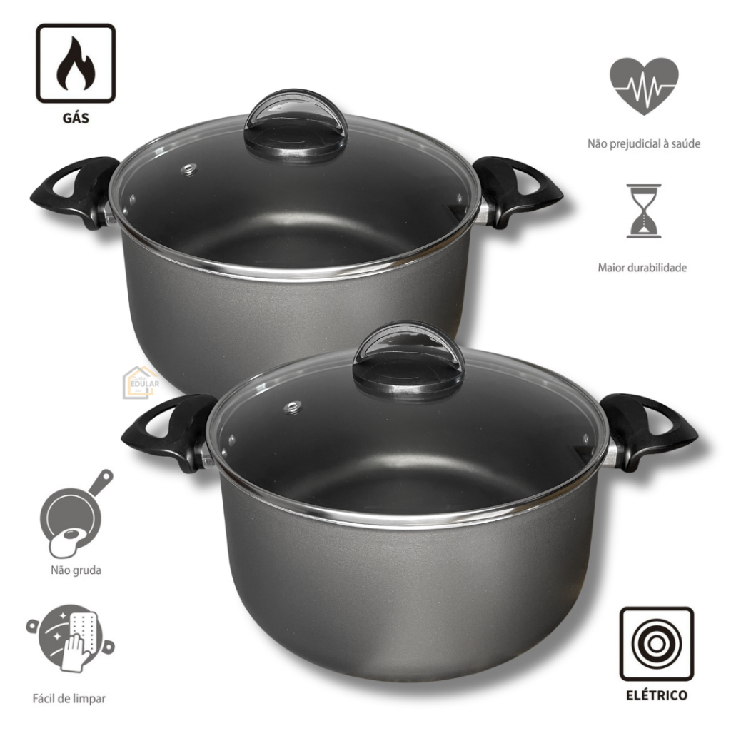 Kit Jogo Panela Plus 2 peças Tamanho Grande 22 e 24 cm Antiaderente Tampa de Vidro Cor Grafite