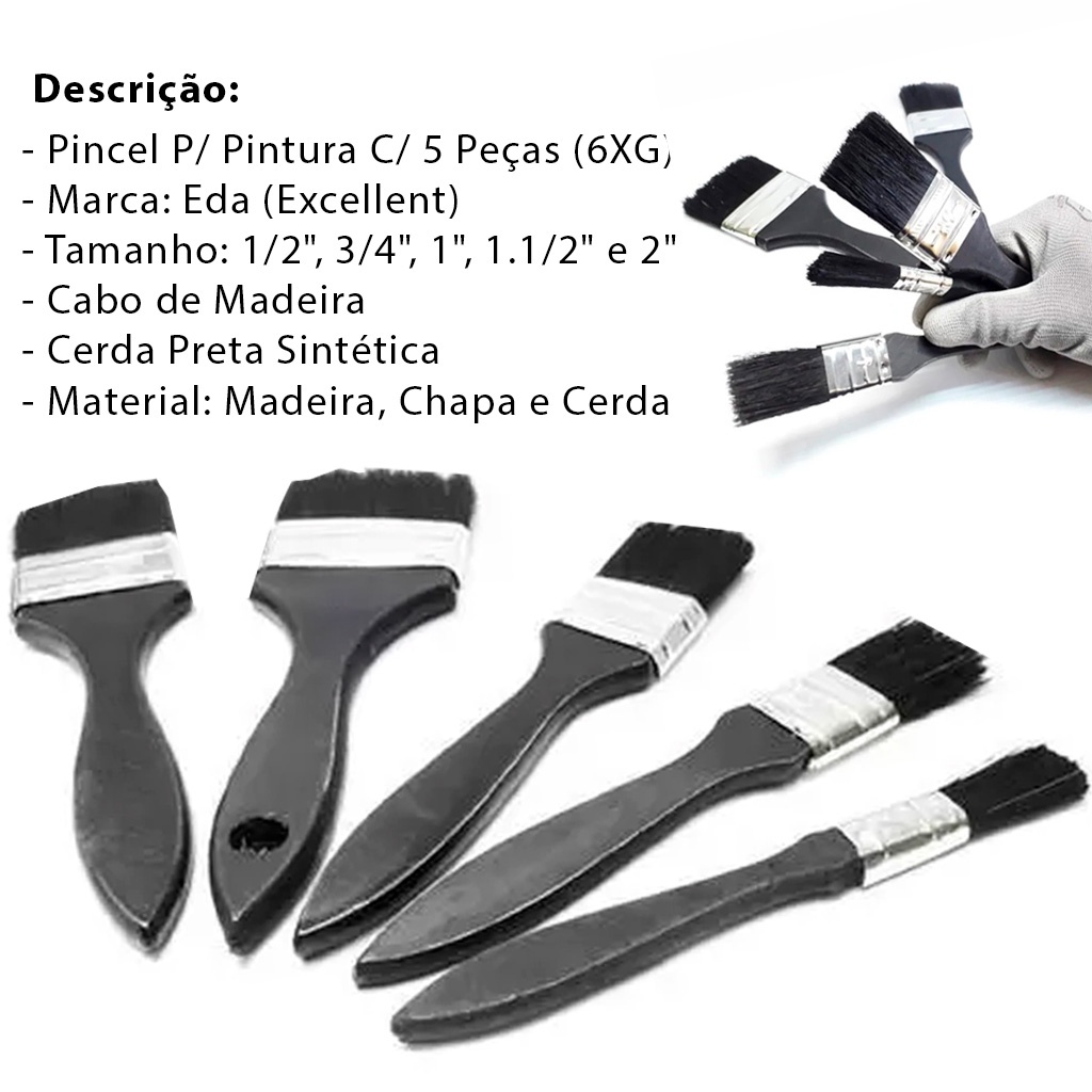 Kit Jogo Pinceis Trincha Para Pintura Com 5 Peças Cabo Madeira Vários Tamanhos Retoque Canto