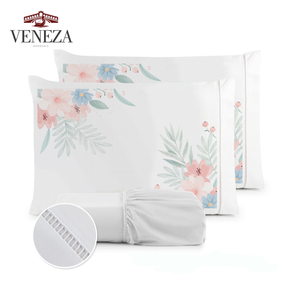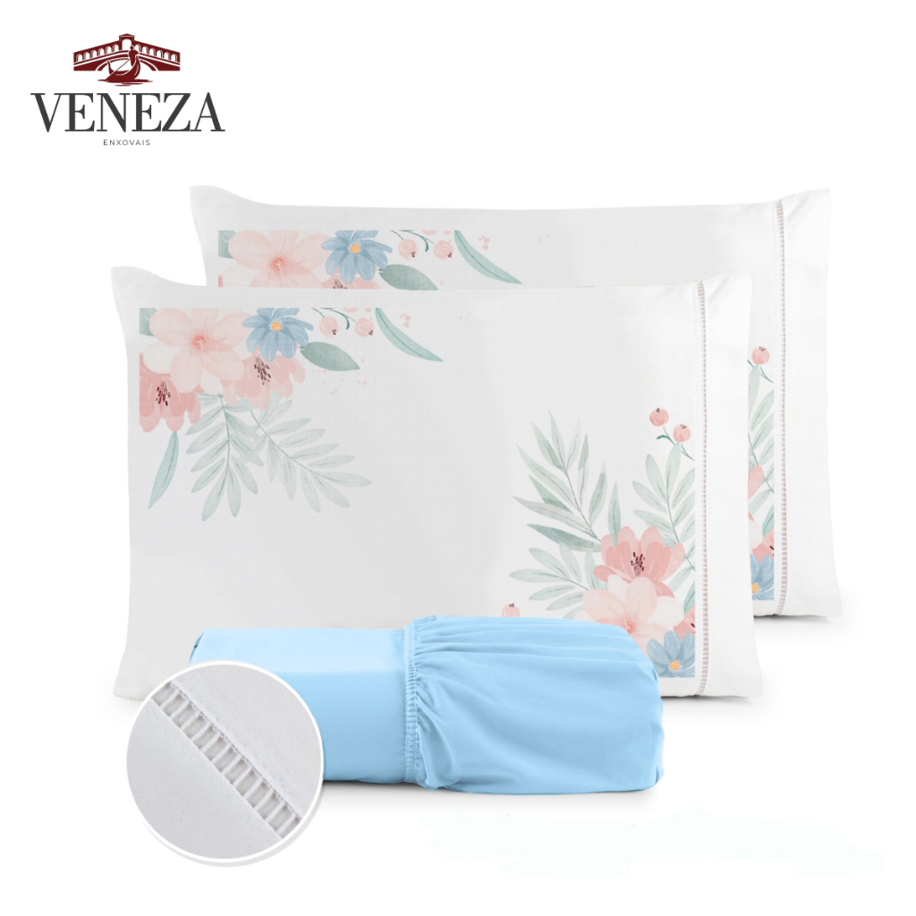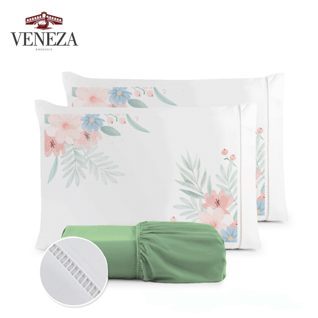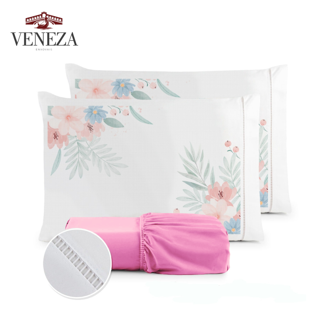 Kit Jogo de Cama Lençol Liso Fronha Estampada Micropercal 400 Fios Ponto Palito