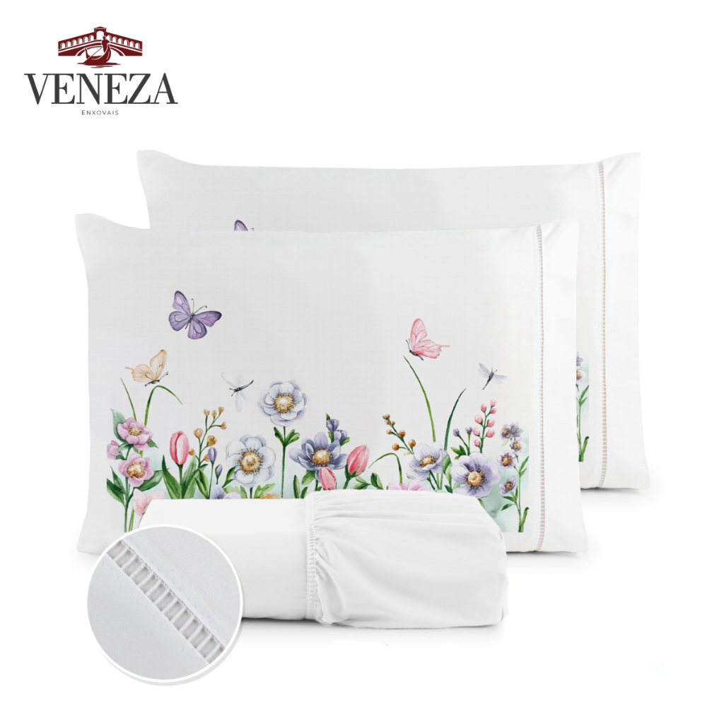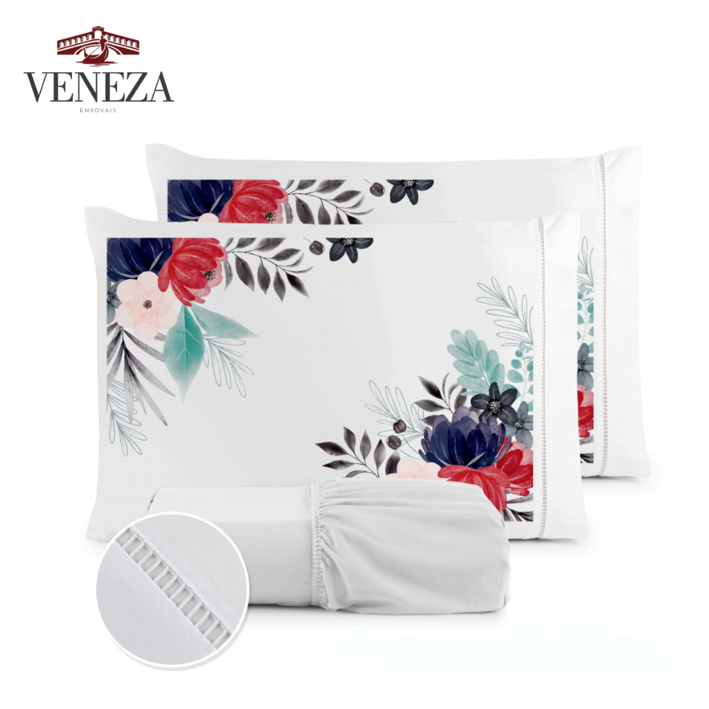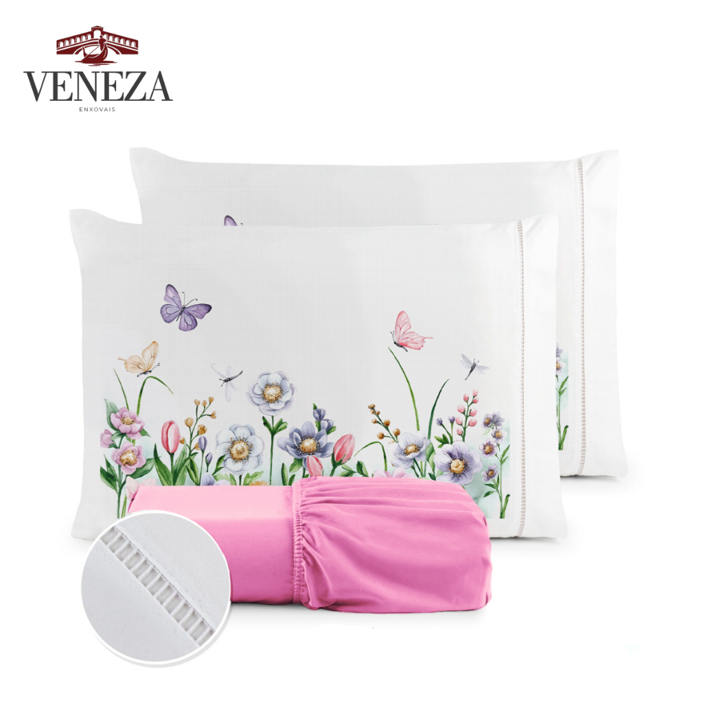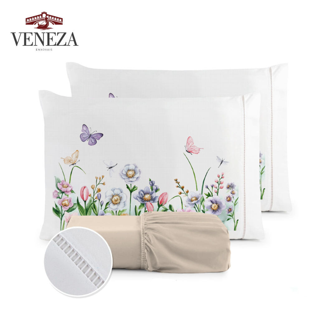 Kit Jogo de Cama Lençol Liso Fronha Estampada Micropercal 400 Fios Ponto Palito