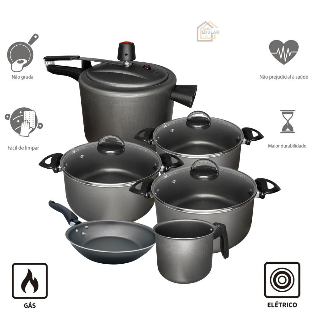 Kit Jogo de Panelas Antiaderente com Panela de Pressão 11 peças e Kit Utensilios Nylon Cor Grafite