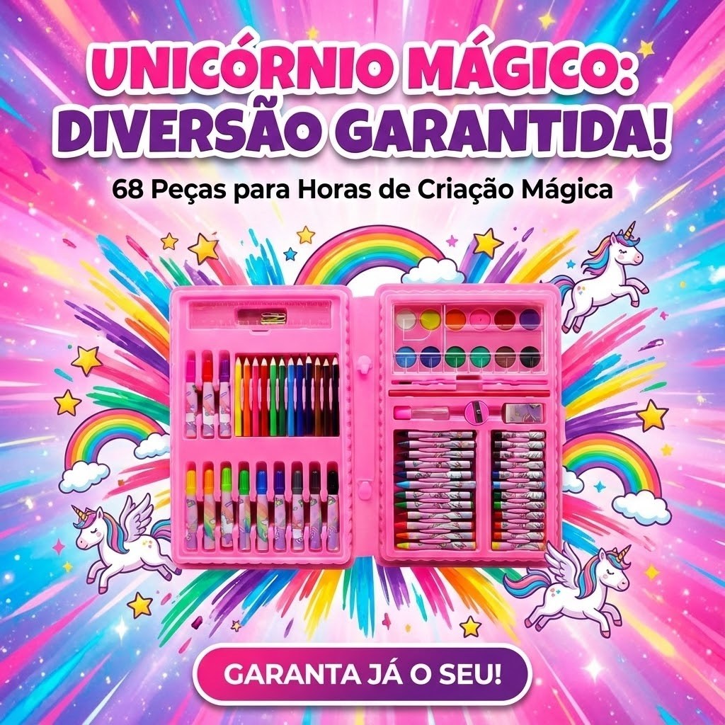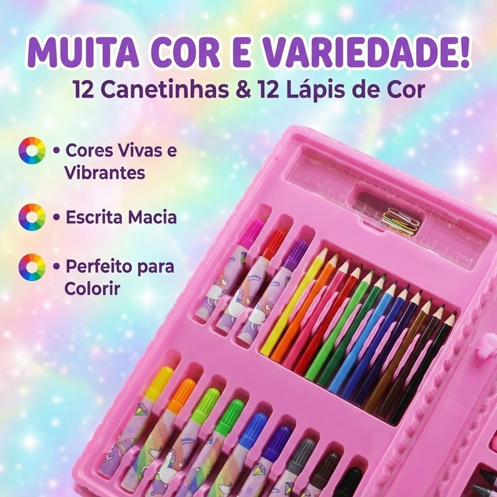 Kit Maleta De Pintura Infantil Unicórnio 68 Peças Estojo Escolar Com Canetinhas Criança Kizumba