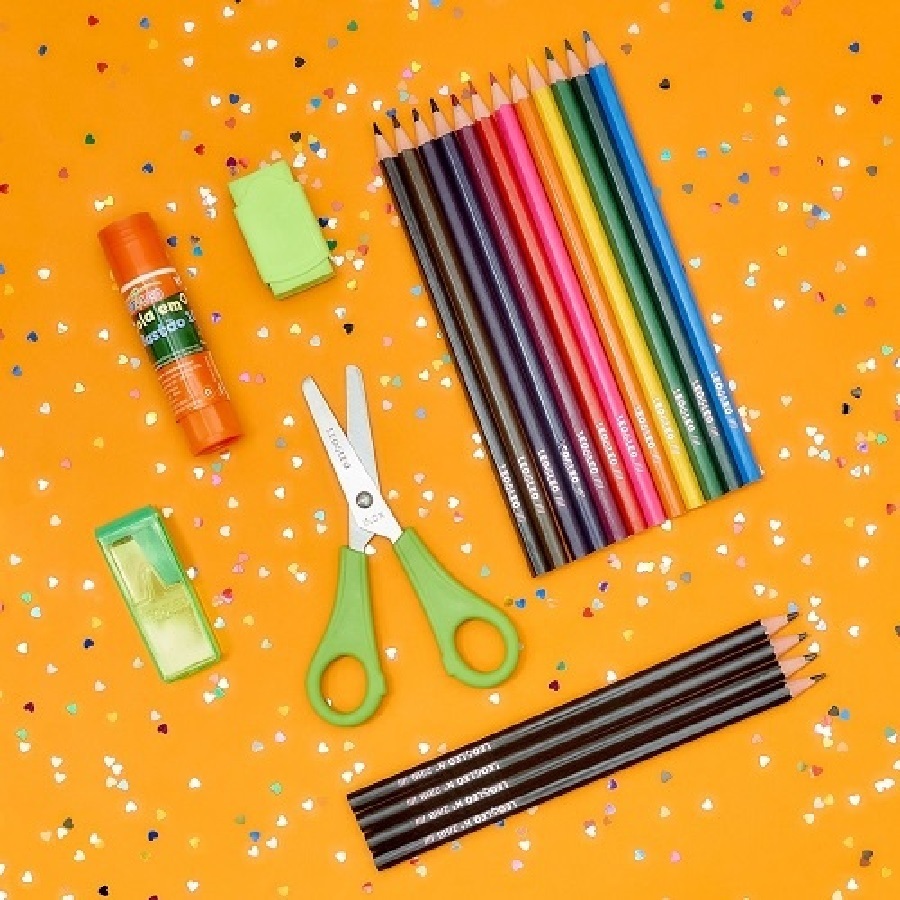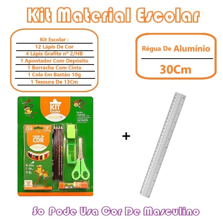 Kit Material Escolar Com Régua De Alumínio E Lápis E Apontador E Borracha E Cola Bastão E Tesoura