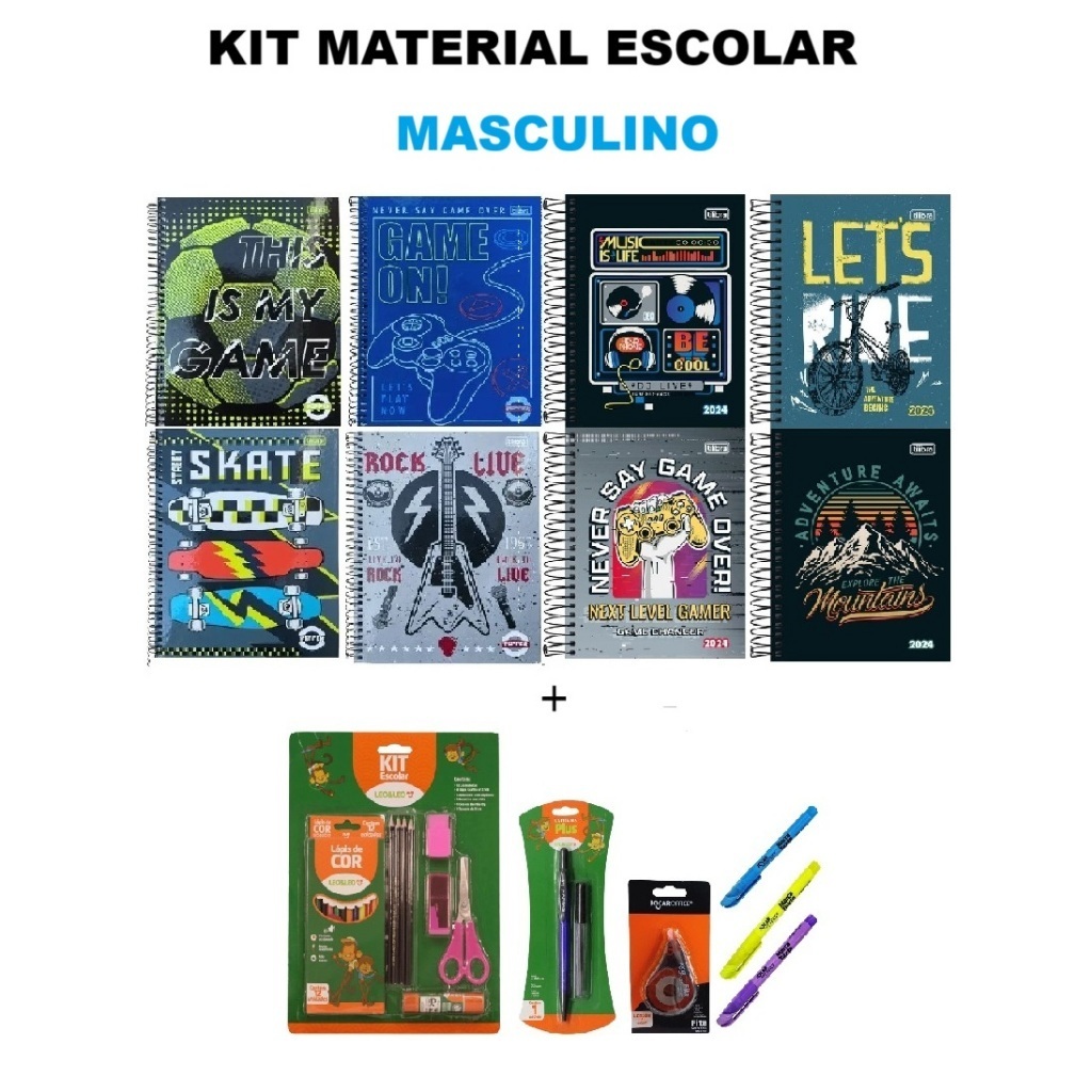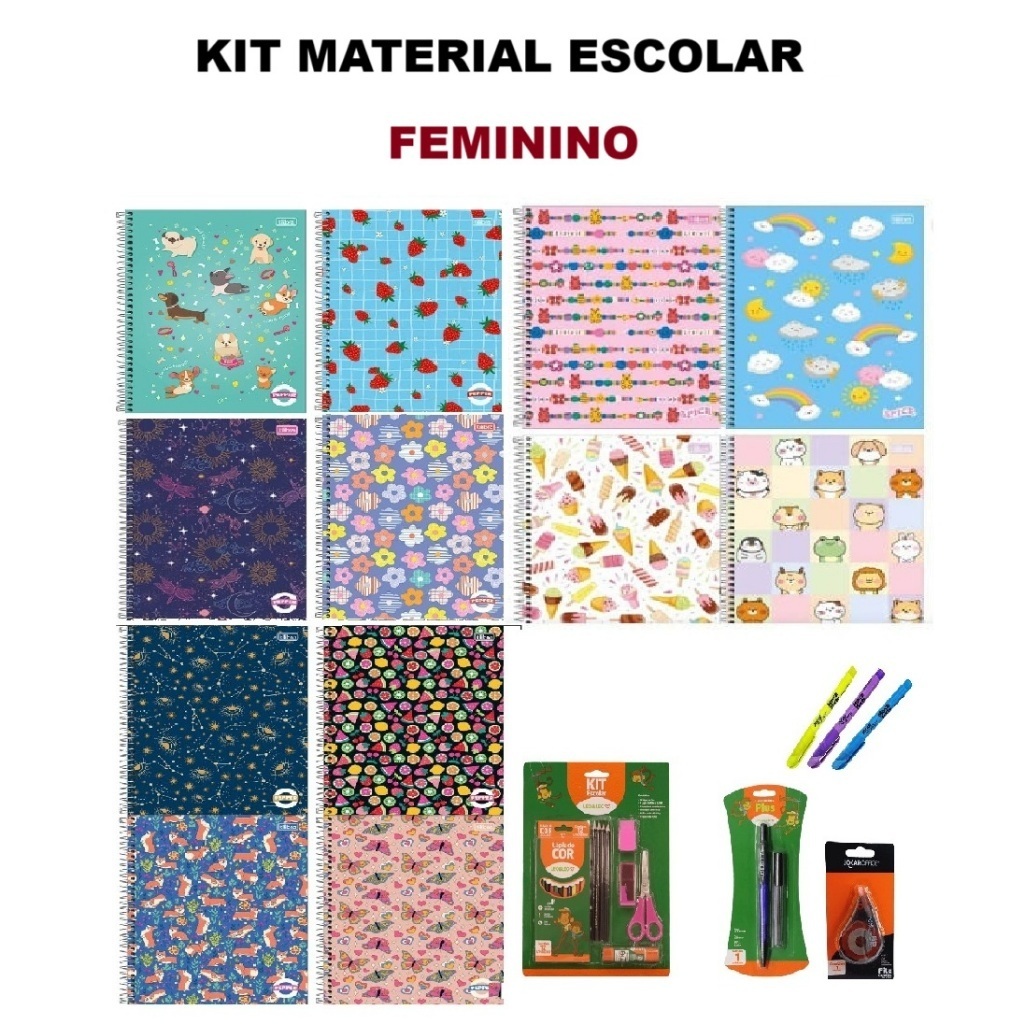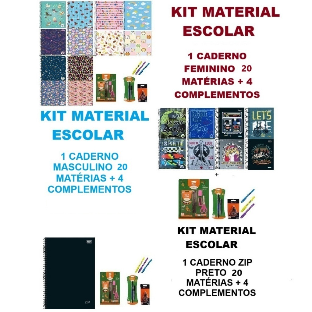 Kit Material Escolar De Caderno 10 Ou 16 Ou 20 Matérias Com Kit Masculino E Feminino e Zip Preto