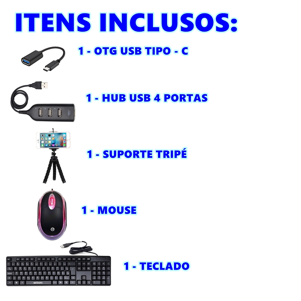 Kit Mobilador Celular Tipo C Portas Usb Conversor Gamer Free Fire + Teclado Mouse Suporte Tripé