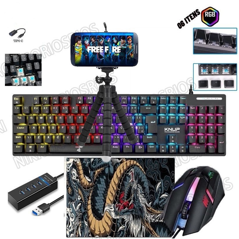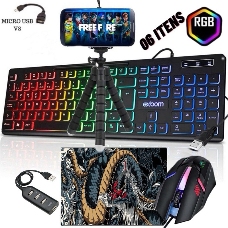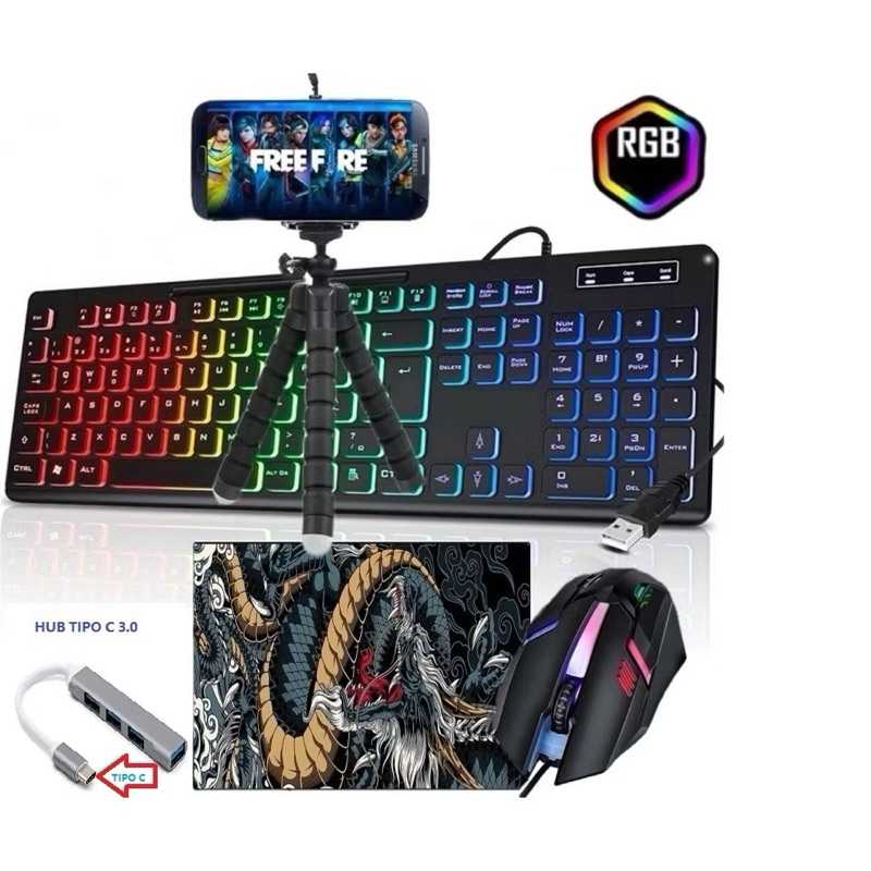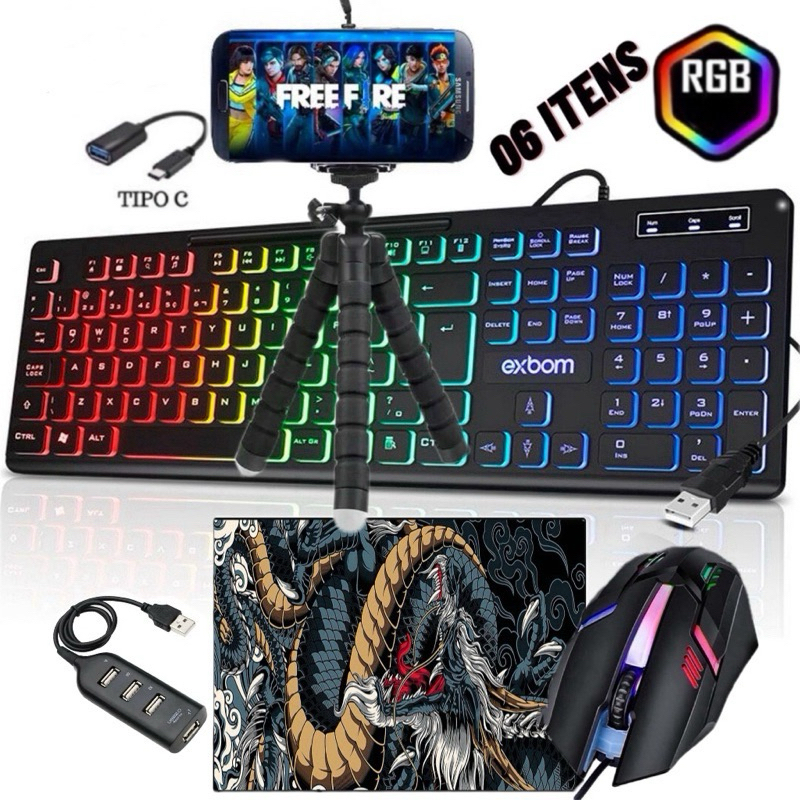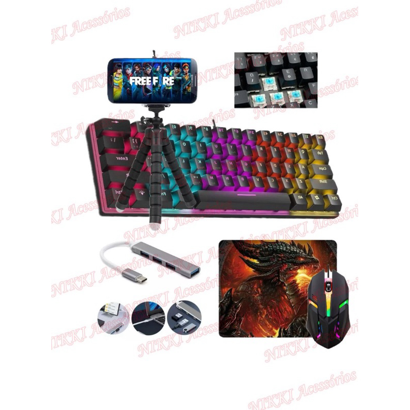 Kit Mobilador Completo 6 Peças Teclado Mouse Gamer Rgb Mouse Pad Hub Tripe Otg Micro e Tipo c