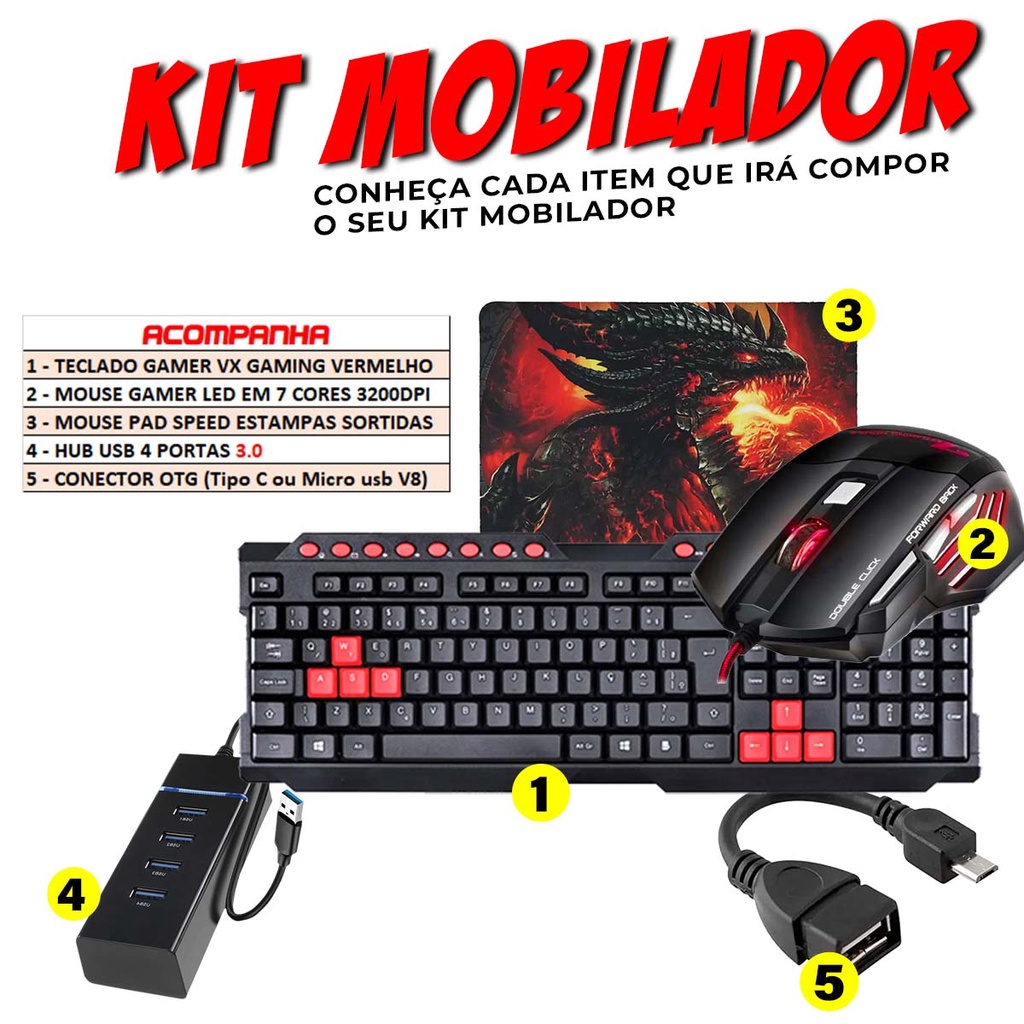 Kit Mobilador Gamer Com Hub 3.0 Sem Delay Teclado Multimídia Mouse e Pad Speed