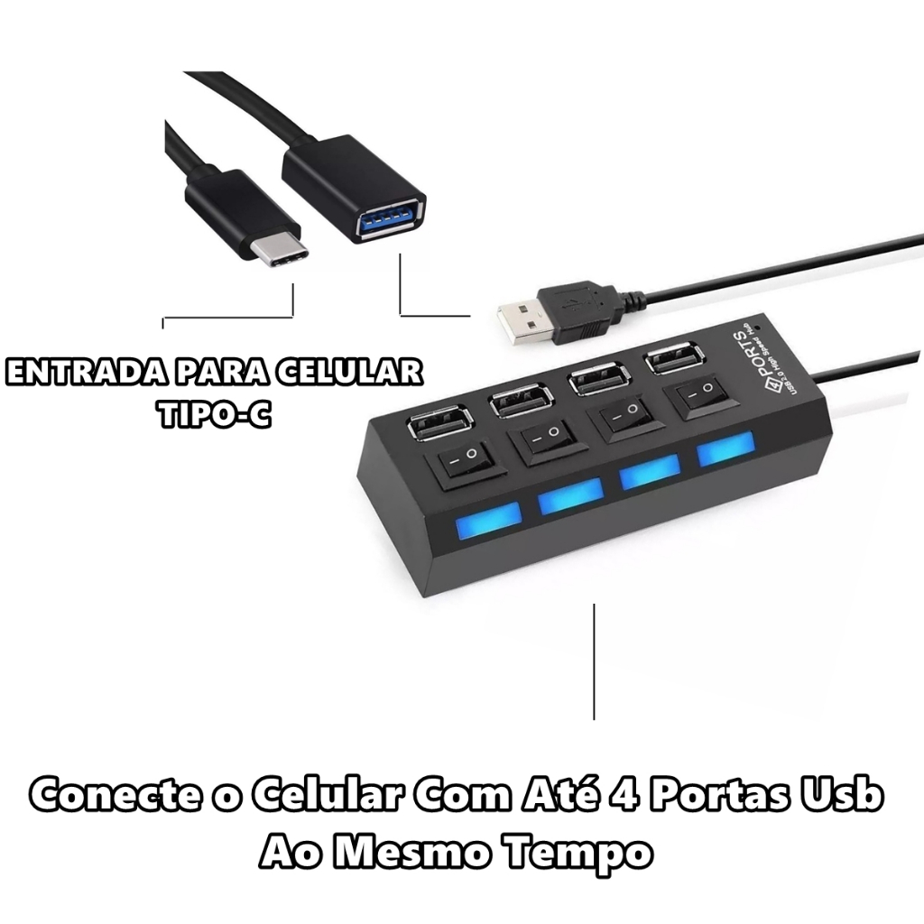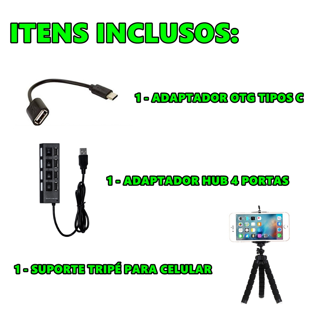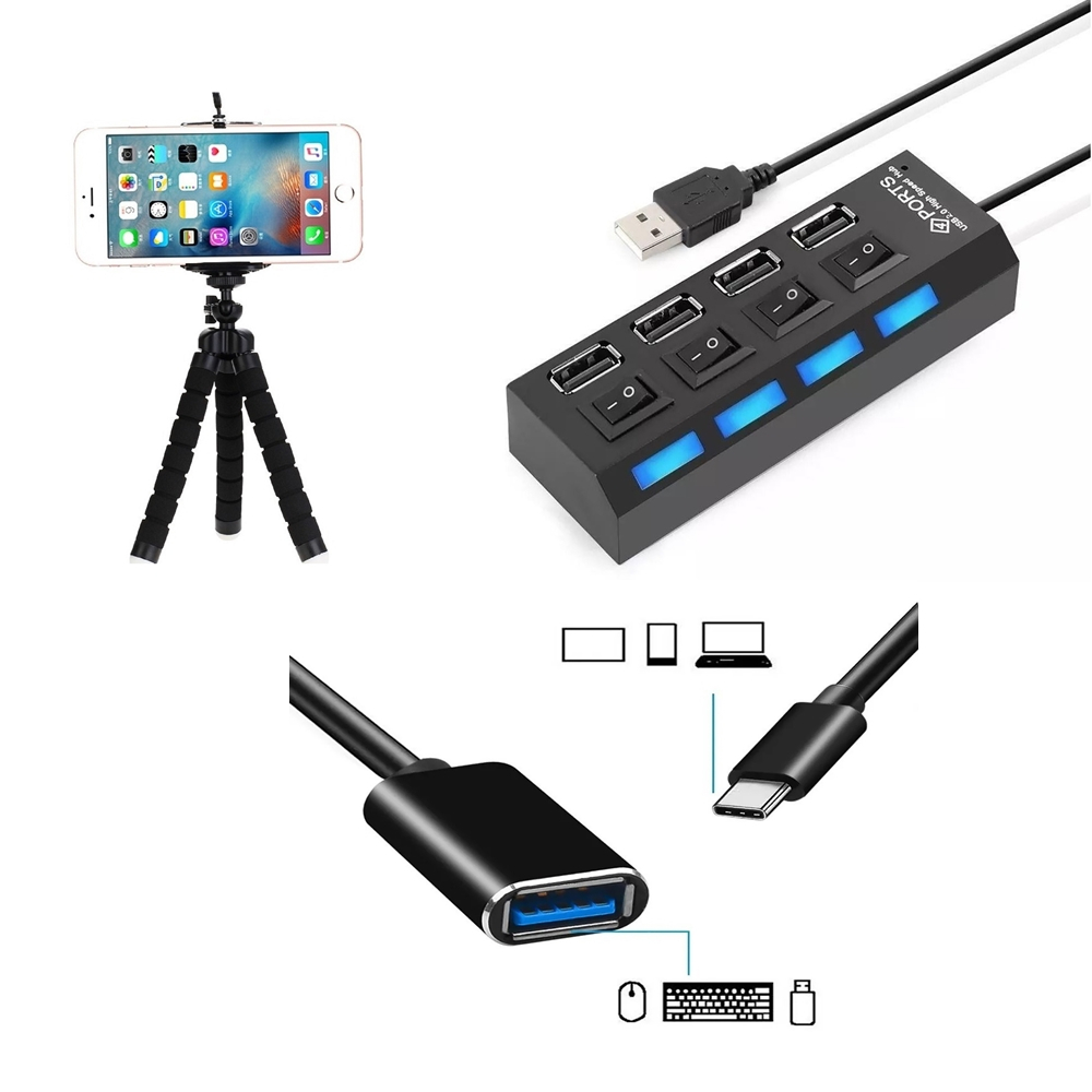 Kit Mobilador Hub 4 Portas Usb Para Celular Cabo Otg Tipo C + Suporte Tripé Adaptador Teclado Mouse