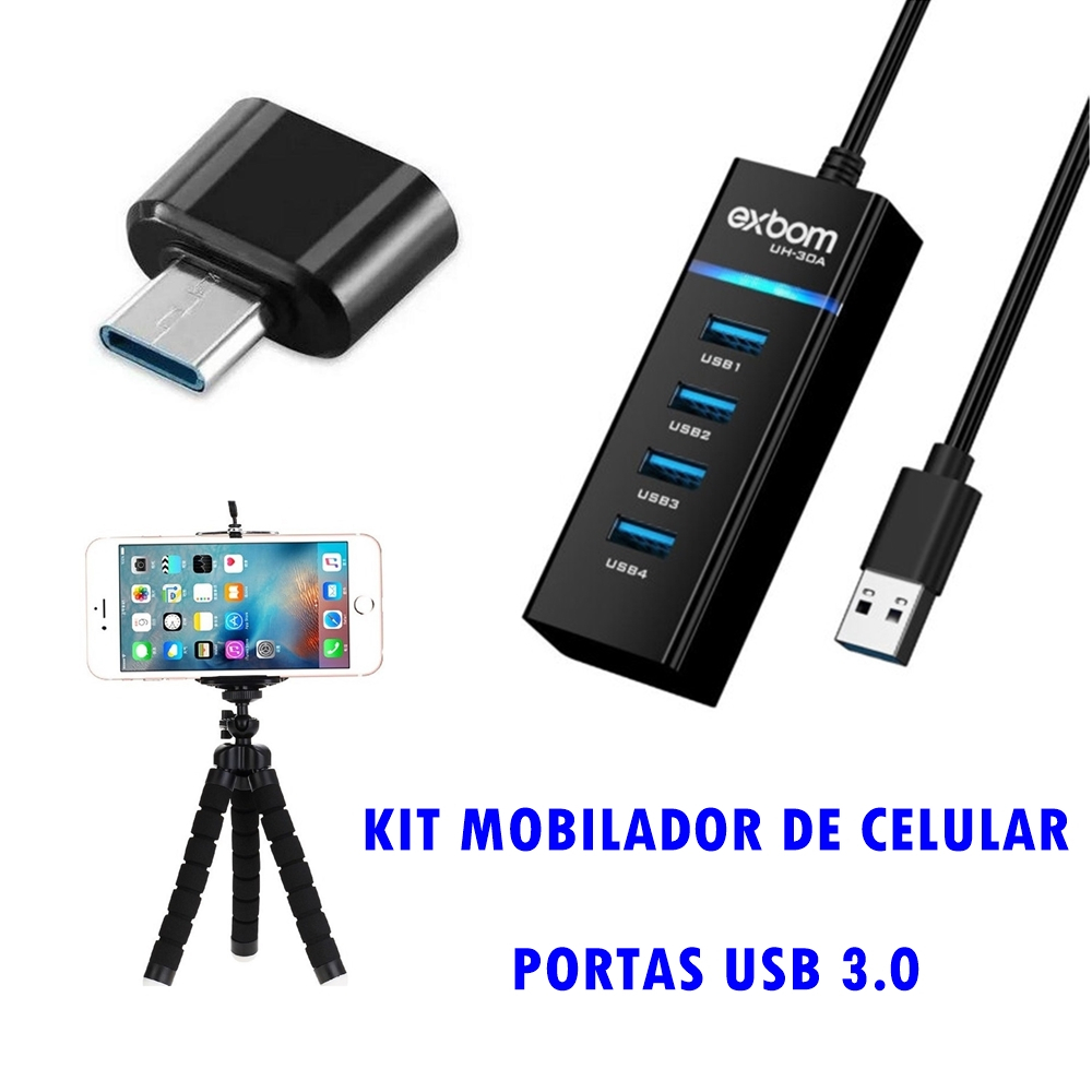 Kit Mobilador Profissional Adaptador Teclado Mouse Para Celular Hub Usb 4 Portas Otg Tipo C Tripé