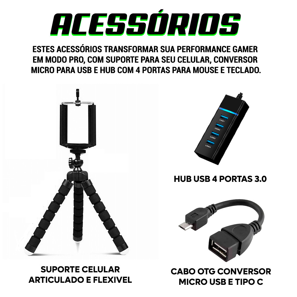 Kit Mobilador de Celular Teclado Uma Mao RGB + Mouse Gamer 1600dpi + Hub usb 3.0 4 Portas