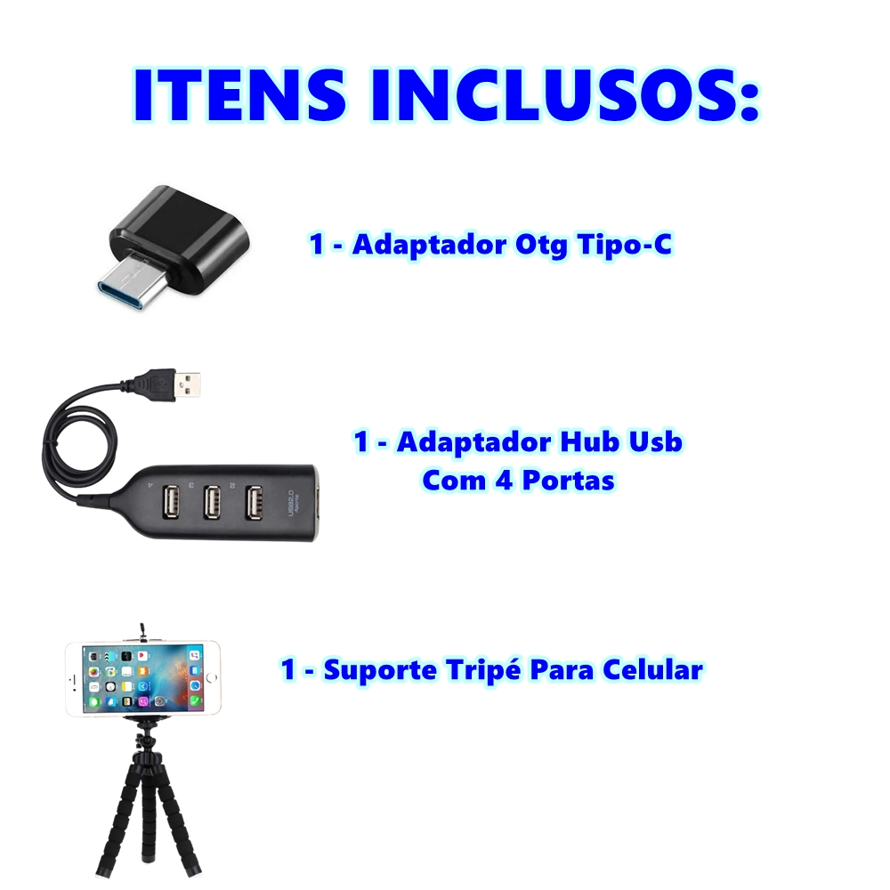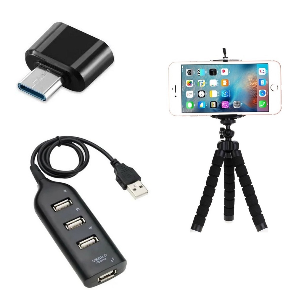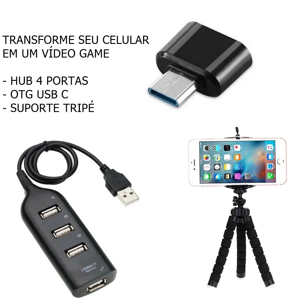 Kit Mobile Gamer Para Celular Hub 4 Portas Usb Para Teclado Mouse + Otg Tipo C Mobilador + Tripé Flexível