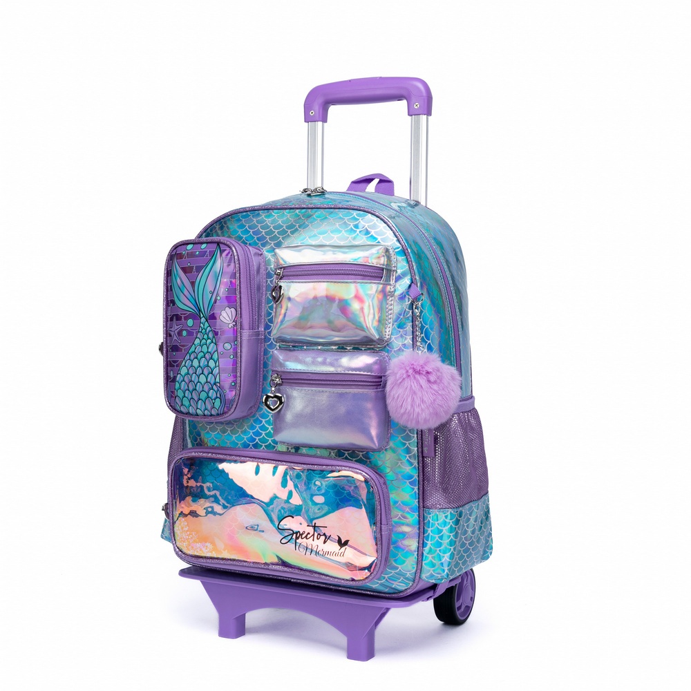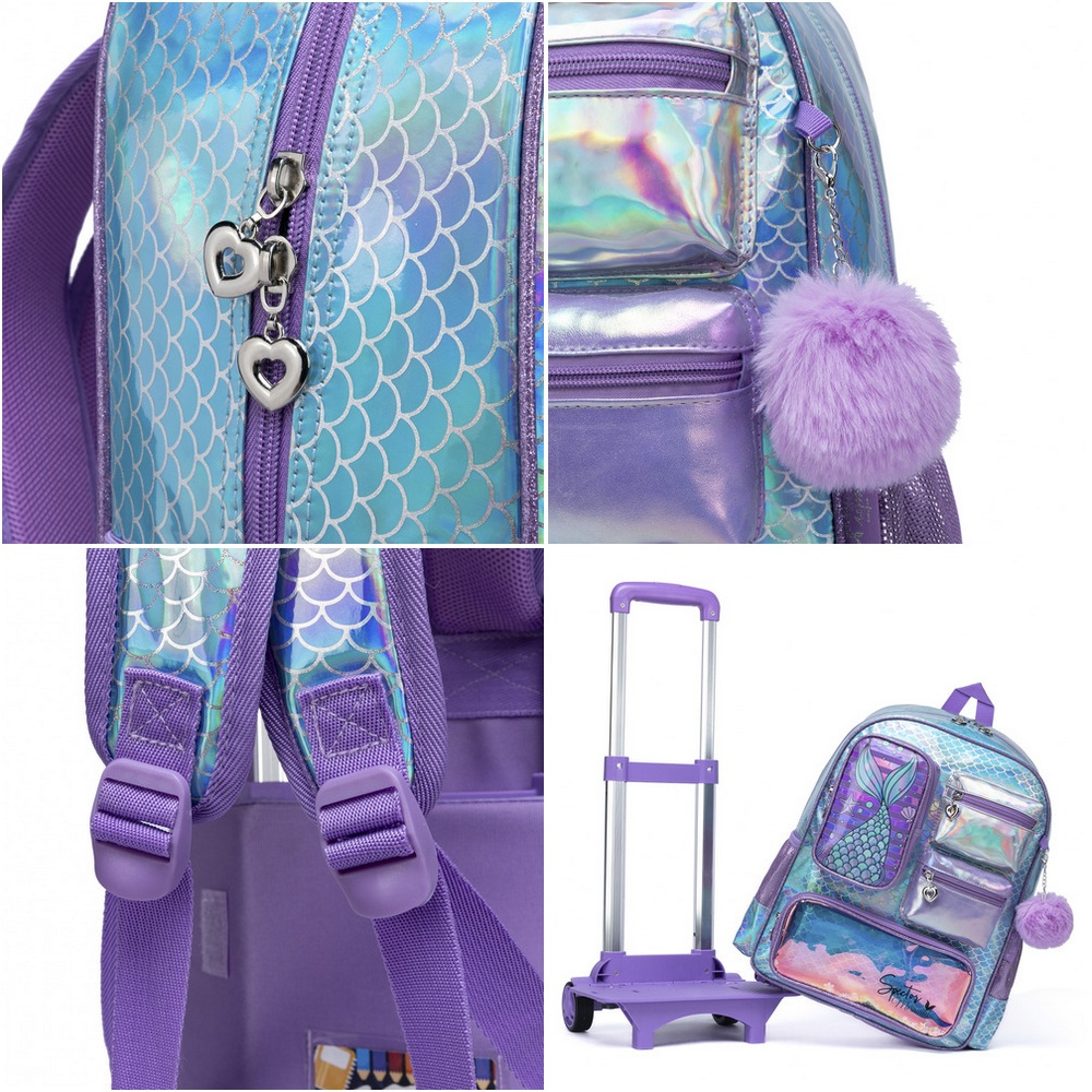 Kit Mochila Escolar Feminina Reforçada Rodinhas Sereia Estojo Lancheira