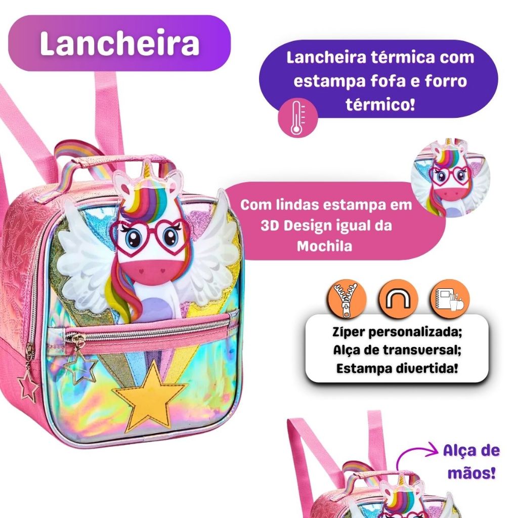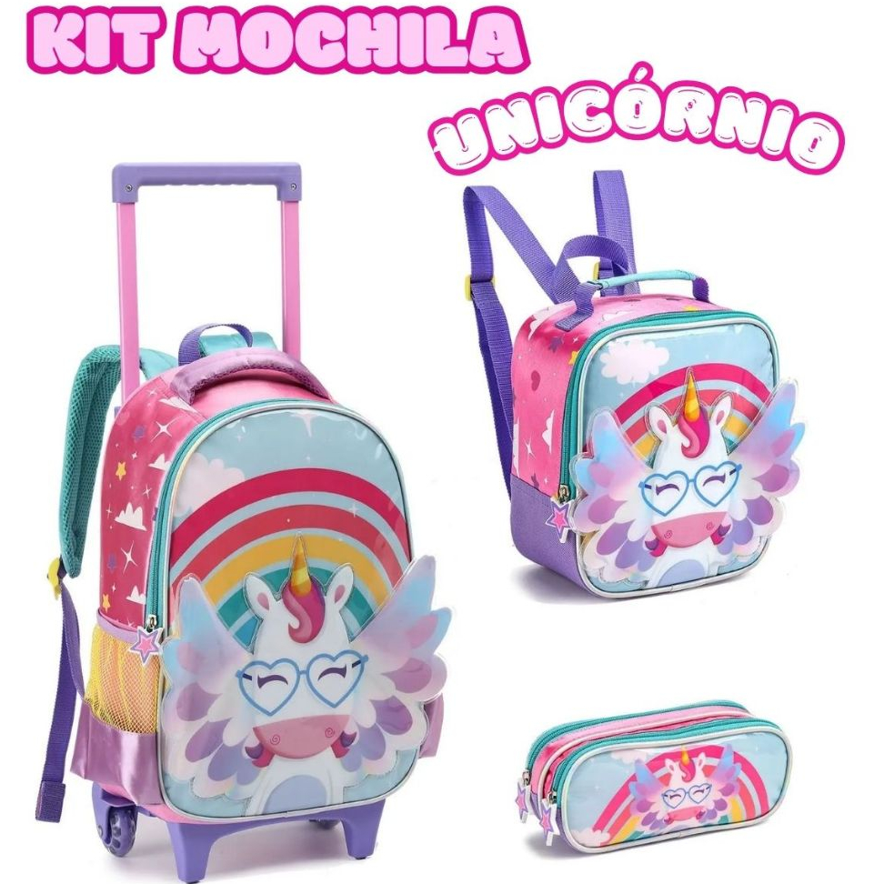 Kit Mochila Escolar Infantil Unicórnio 2 Em 1 Rodinhas Criança Menina