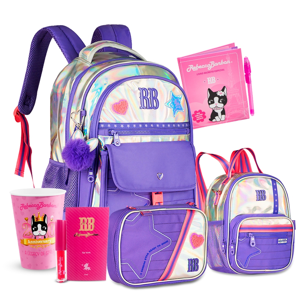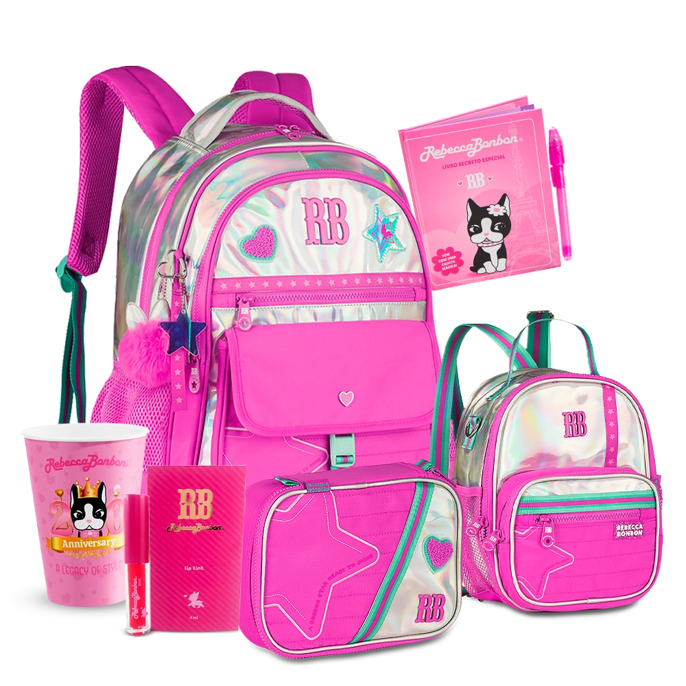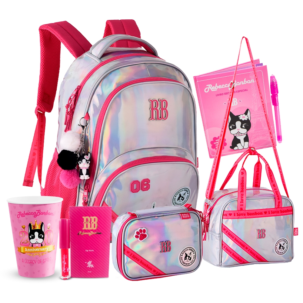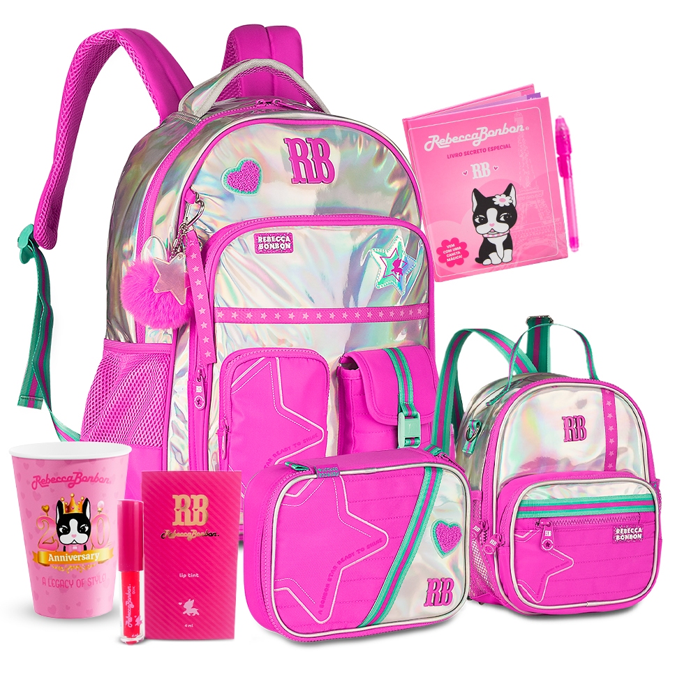 Kit Mochila Escolar Estojo Box Lancheira Térmica Rebecca Bonbon Juvenil Feminino Holoráfico