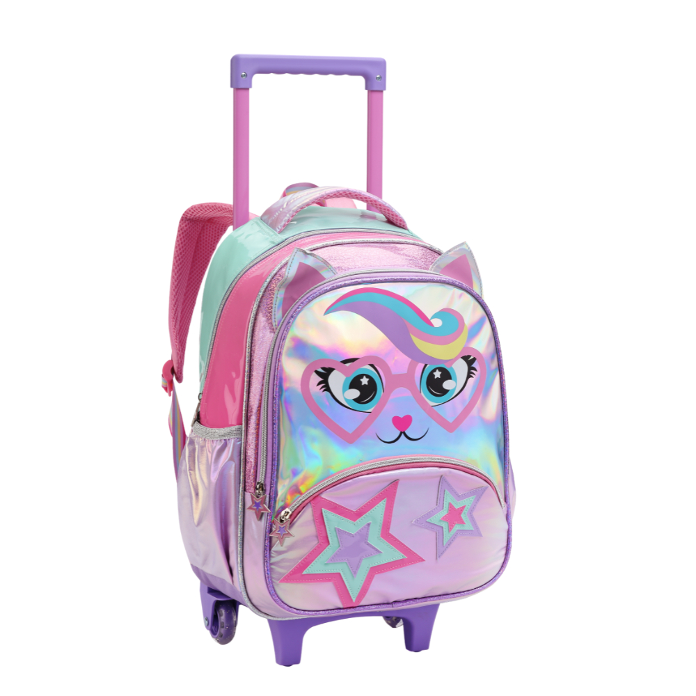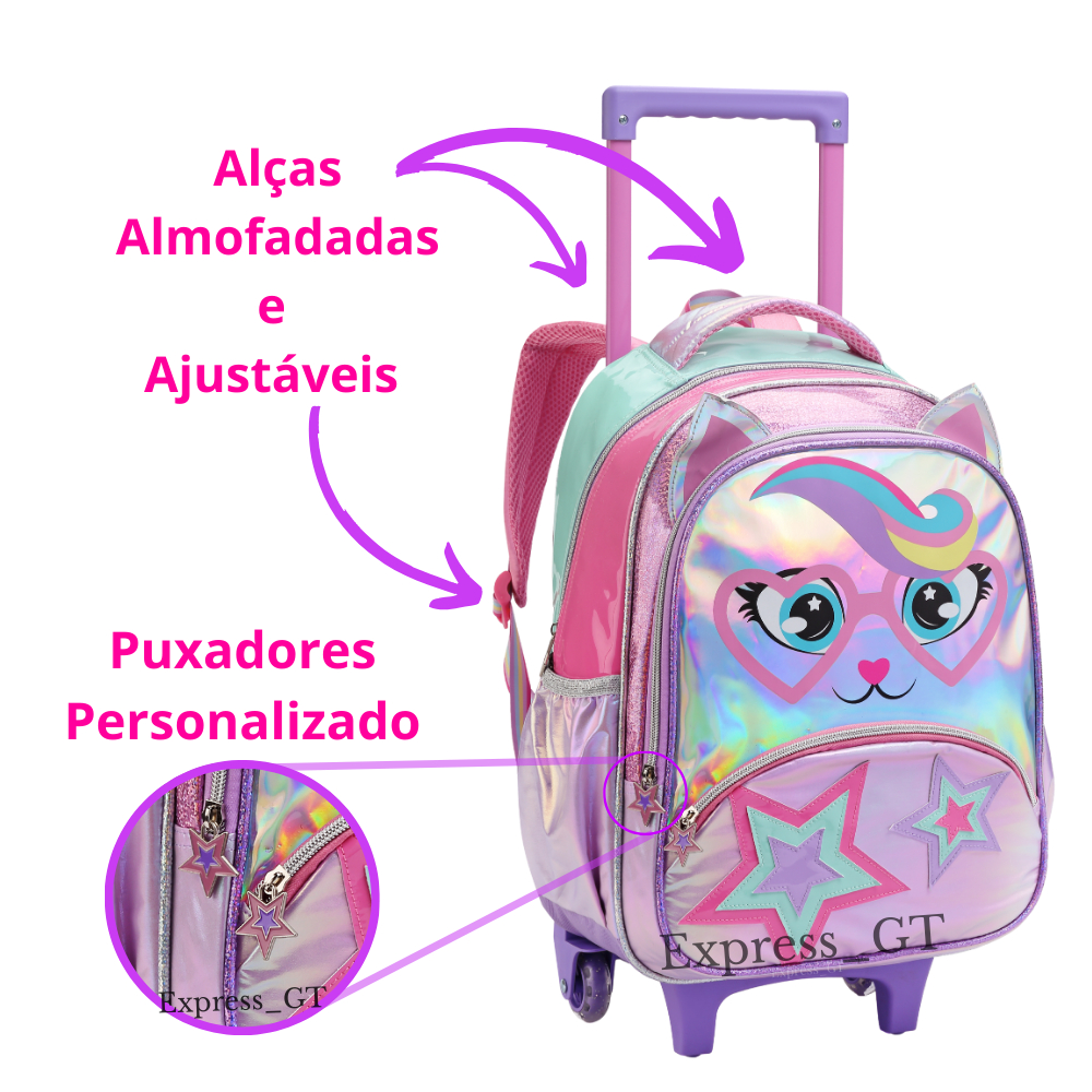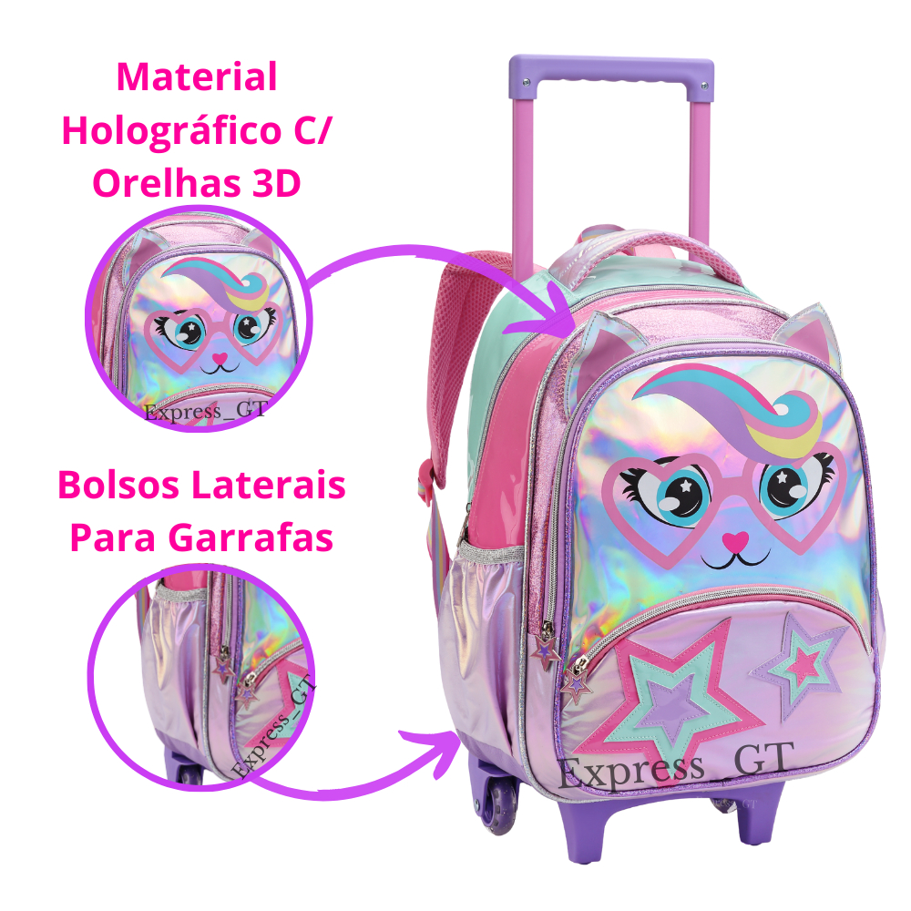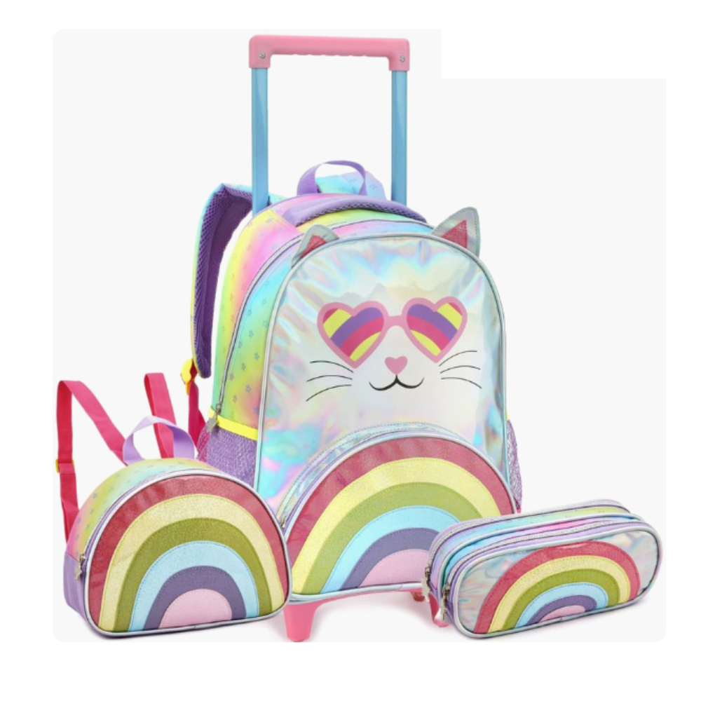 Kit Mochila Infantil Menina Escola De Rodinha Feminina Gatinha Arco Íris Lancheira Térmica e Estojo
