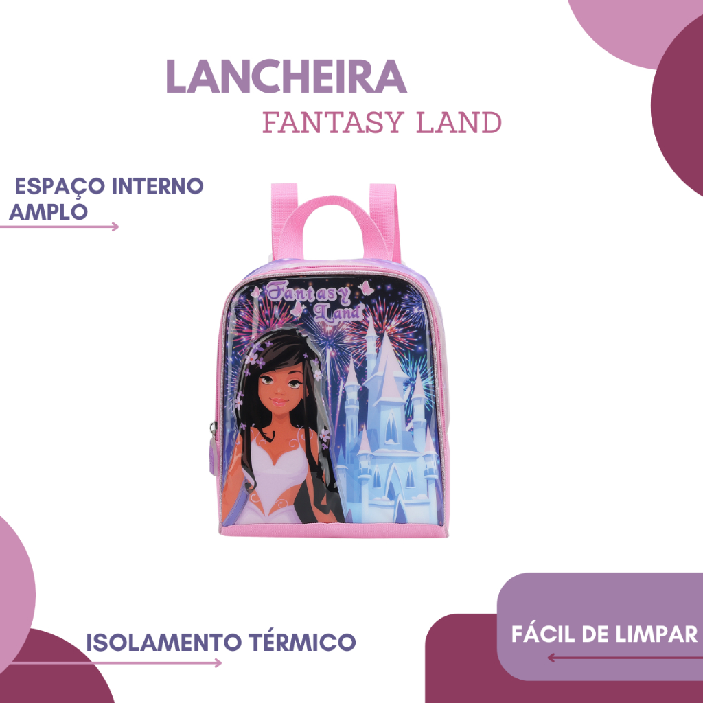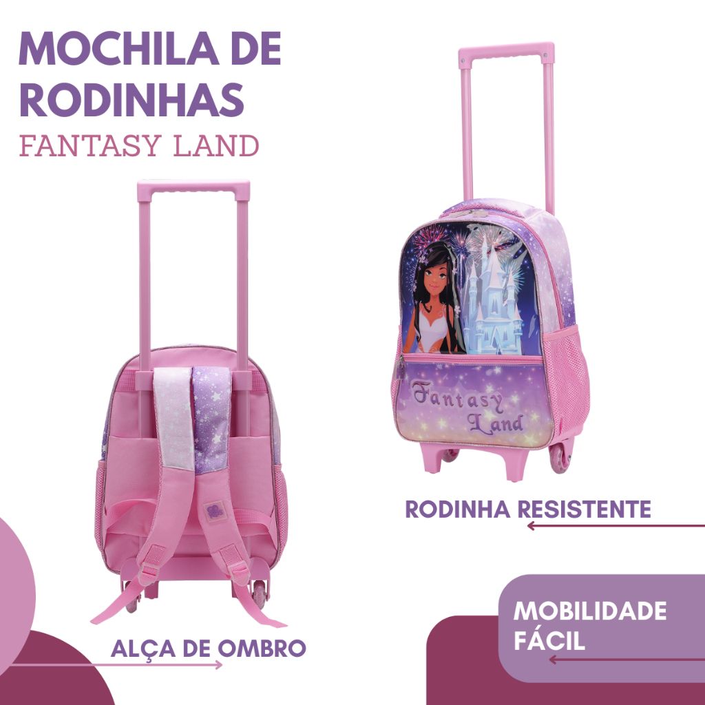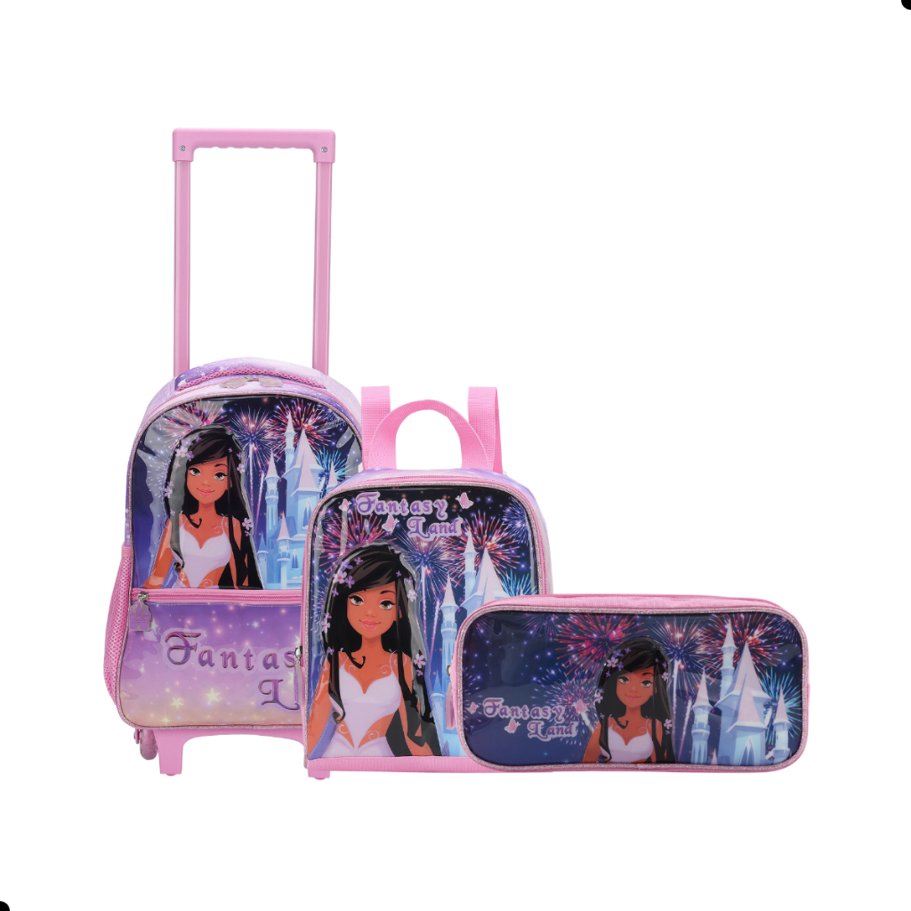Kit Mochila Rodinha Estojo Lancheira Escolar Infantil Volta Aulas Fantasy Land Completo e Estiloso