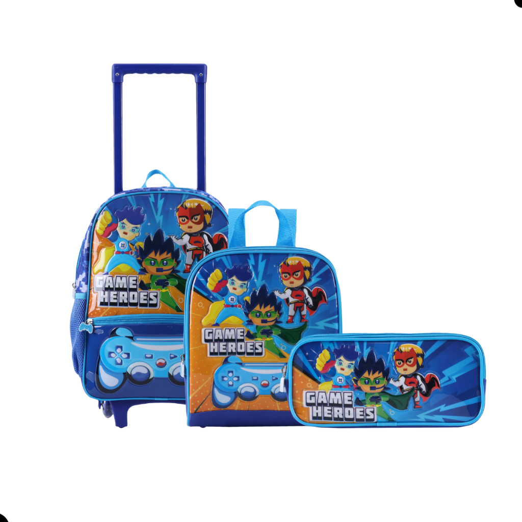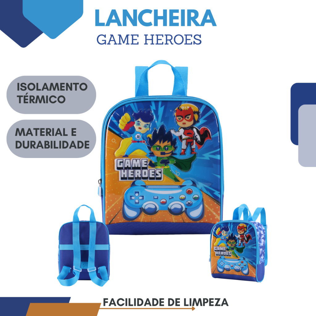 Kit Mochila Rodinha Estojo Lancheira Escolar Infantil Volta Aulas Game Heroes Completo e Estiloso