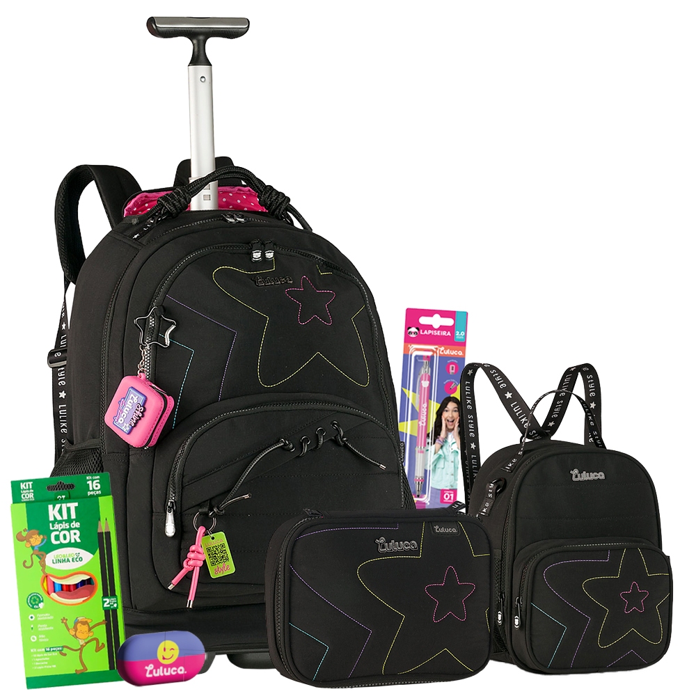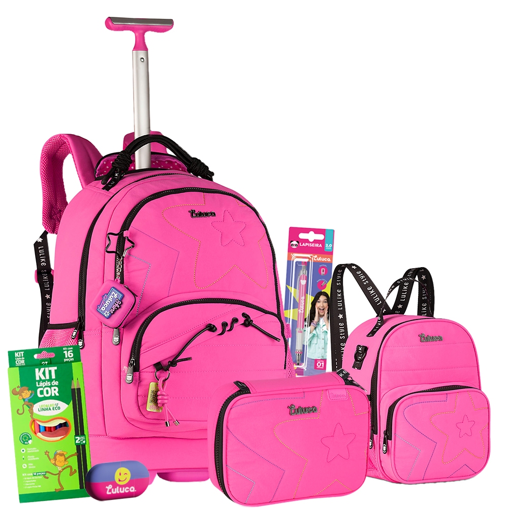 Kit Mochila Rodinha Estojo Lancheira Soft Reforcada Squeeze Marmita Oficial Rebecca Bonbon Meninas