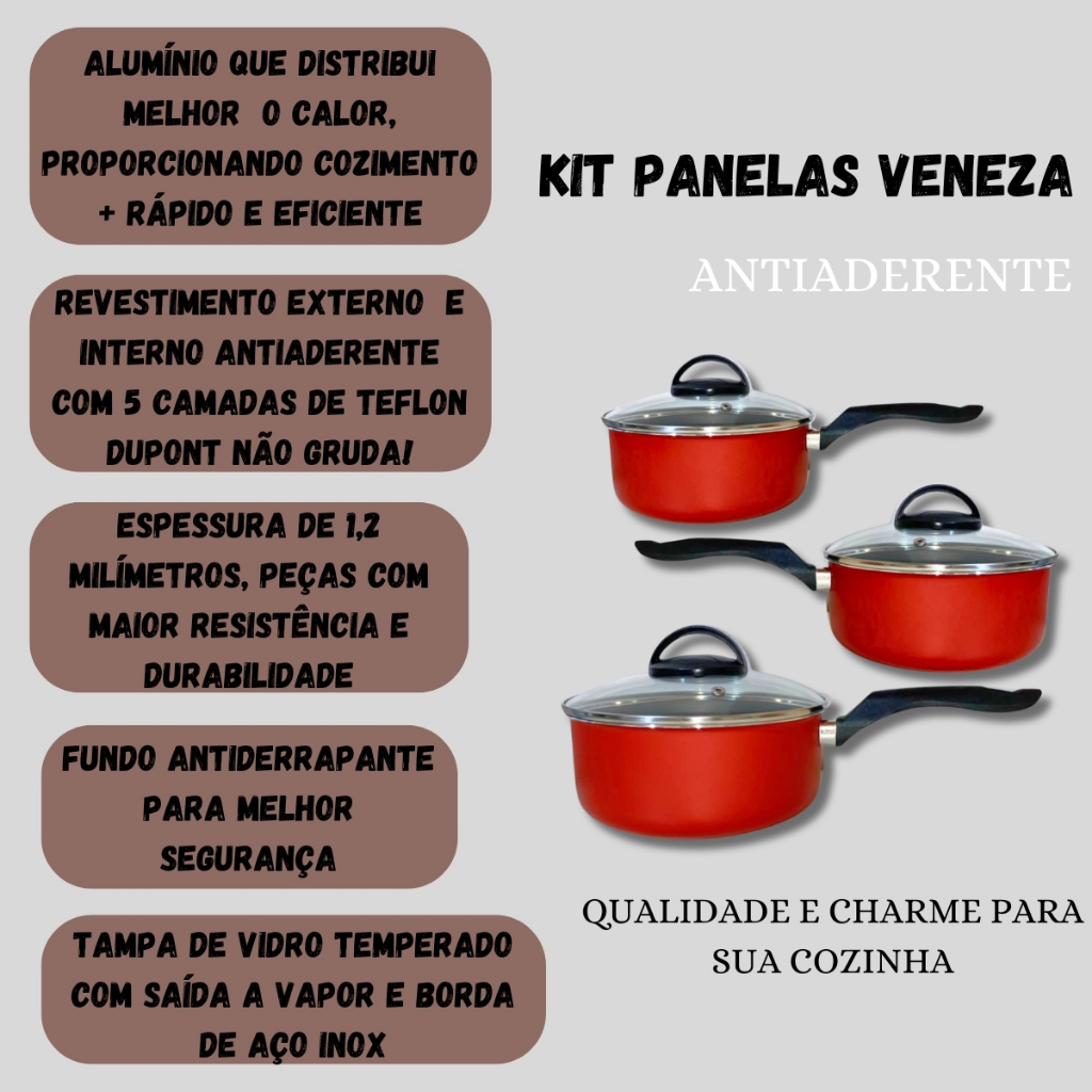 Kit Panelas Caçarolas Veneza Antiaderente 3 peças