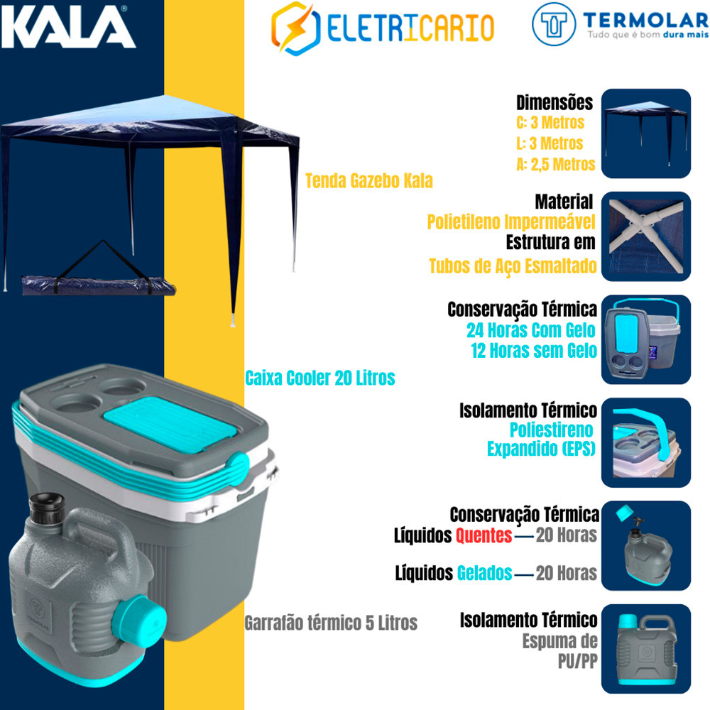 Kit Praia Tenda Gazebo Azul 3x3 Metros Kala Cooler Cinza 20 Litros Garrafão 5 Litros Cinza Termolar