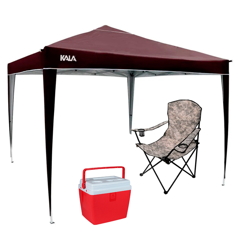 Kit Praia Tenda Gazebo Dobrável 3x3 Metros Cadeira Camuflada Dobrável Cooler 28 Litros Vermelho