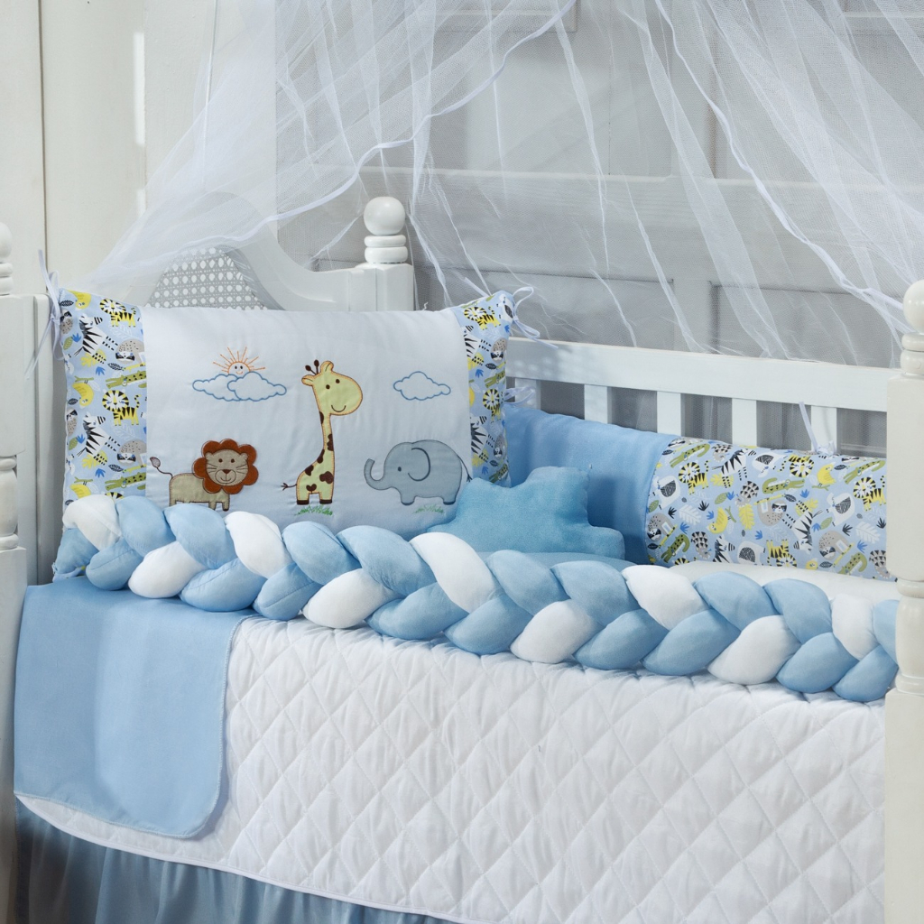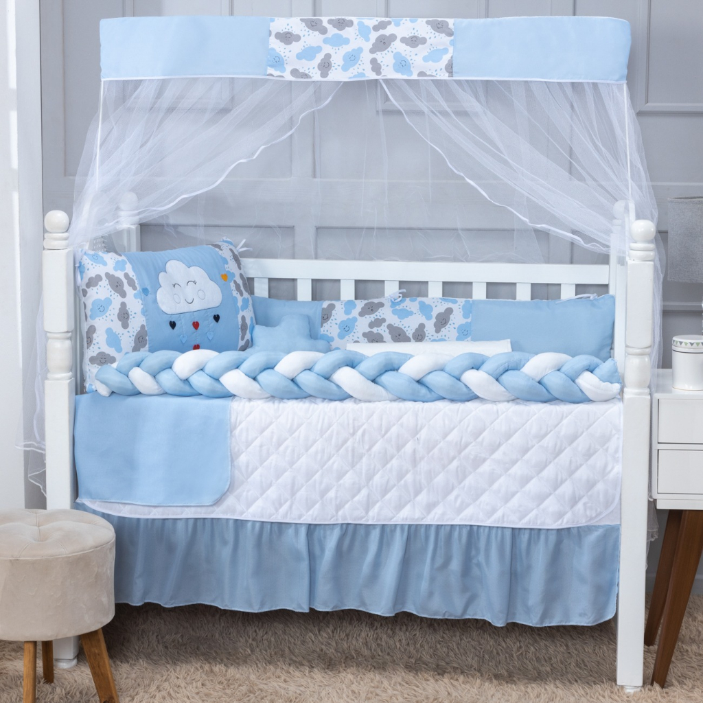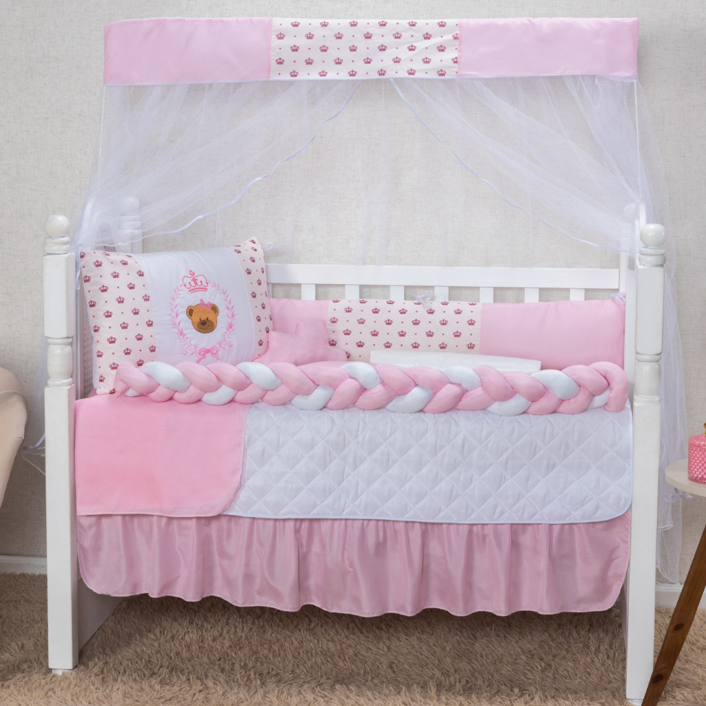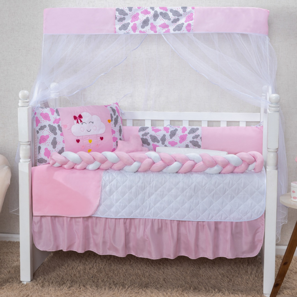 Kit Protetor de Berço Americano Menino e Menina 11 Peças Com Trança e Mosquiteiro Padrão Americano