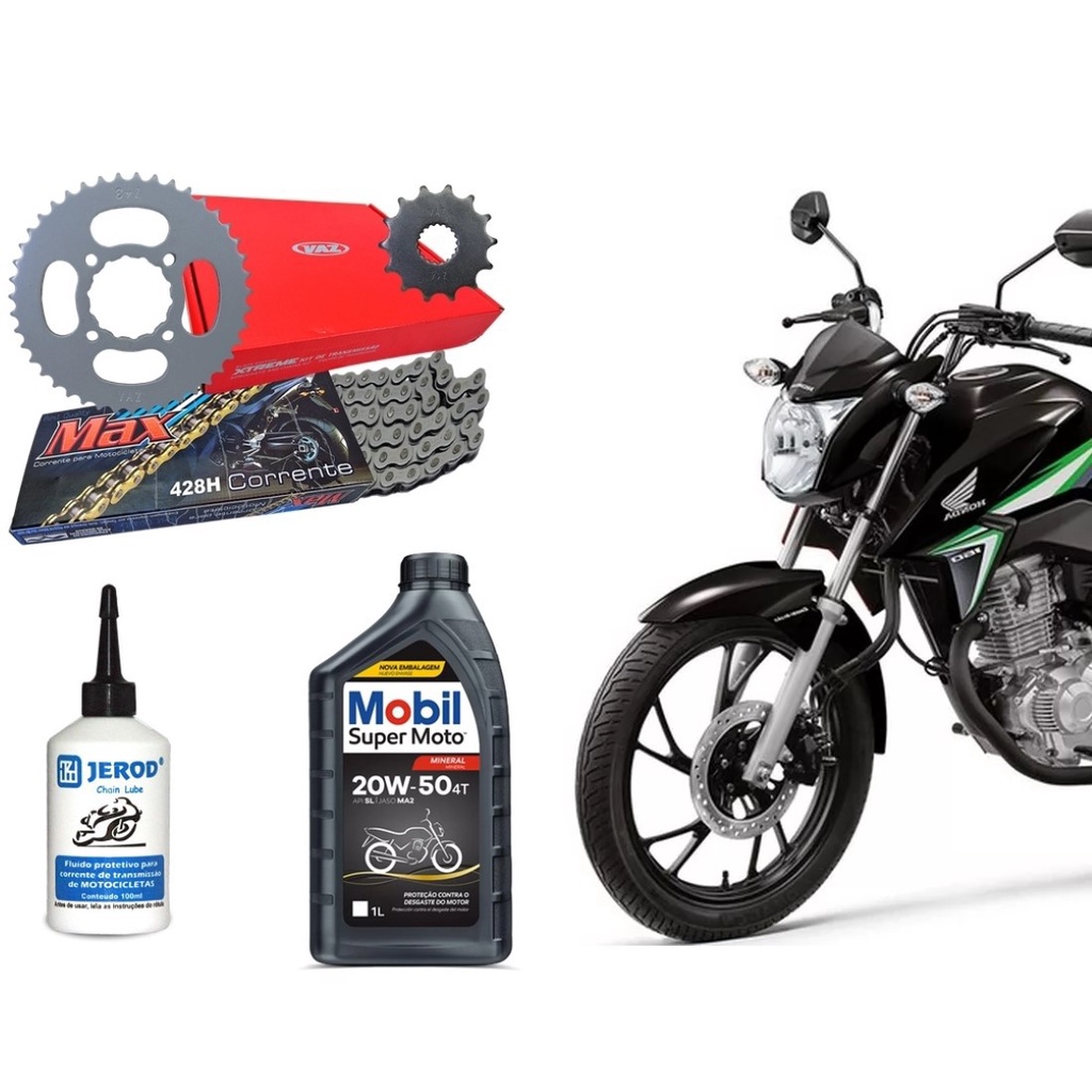 Kit Relacao Vaz Com Corrente Max + 01 Litro De Oleo Mobil 20w50 + Oleo Lubrificante Corrente 100ml Honda Cg Titan Cargo Fan 160 De 2015 Ate 2021