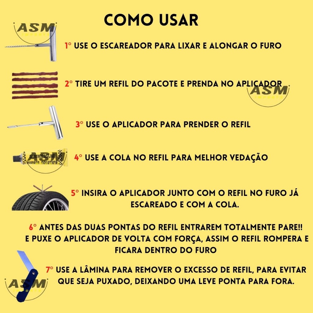 Kit Reparo De Pneu Metal Com Refis + Maleta Black Borracheiro Refil Modelo Macarrão Peneu Sem Câmara