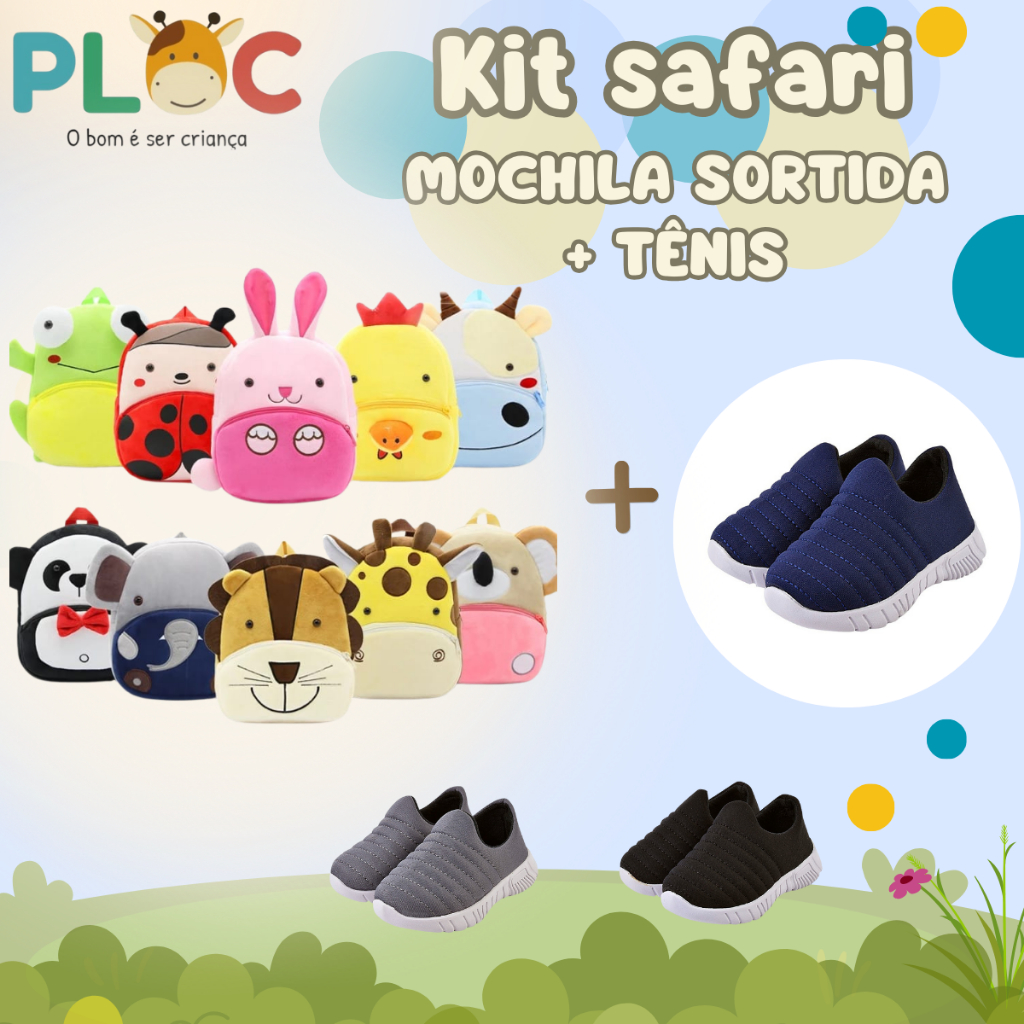 Kit Safari Ploc: MOCHILA SAFARI SORTIDA MENINO + Tênis Calce Fácil Passeio Escola P26