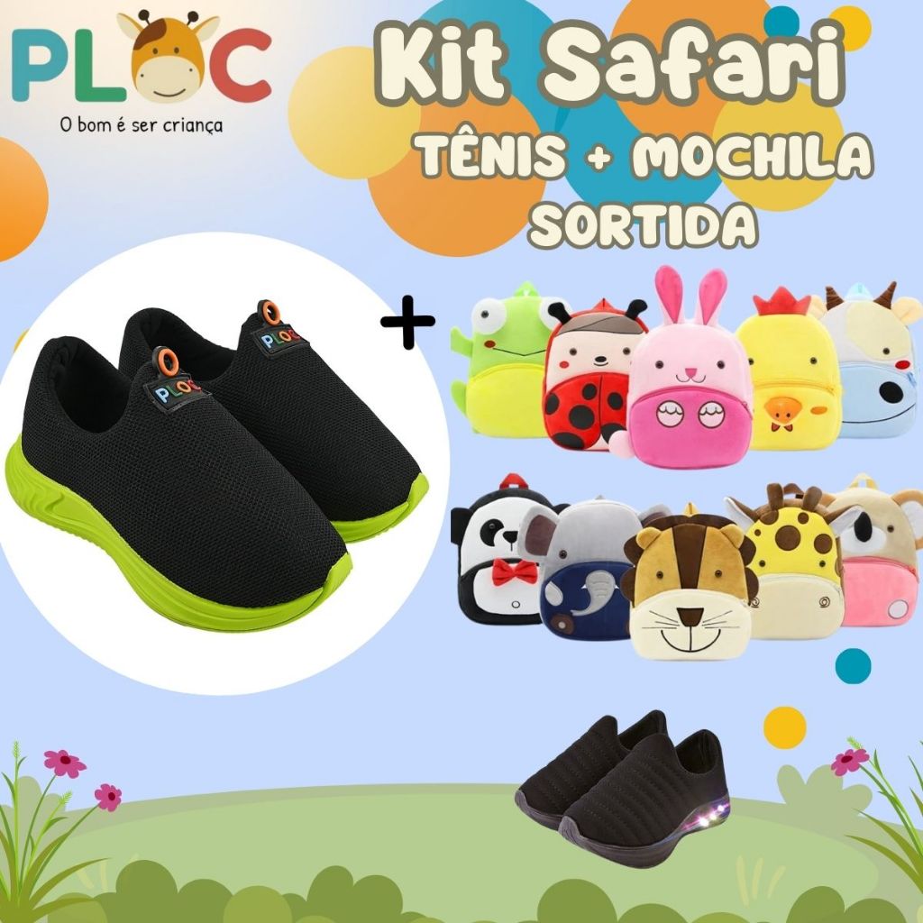 Kit Safari Ploc: Tênis Calce Fácil Passeio Escola P26 + MOCHILA SAFARI SORTIDA MENINO