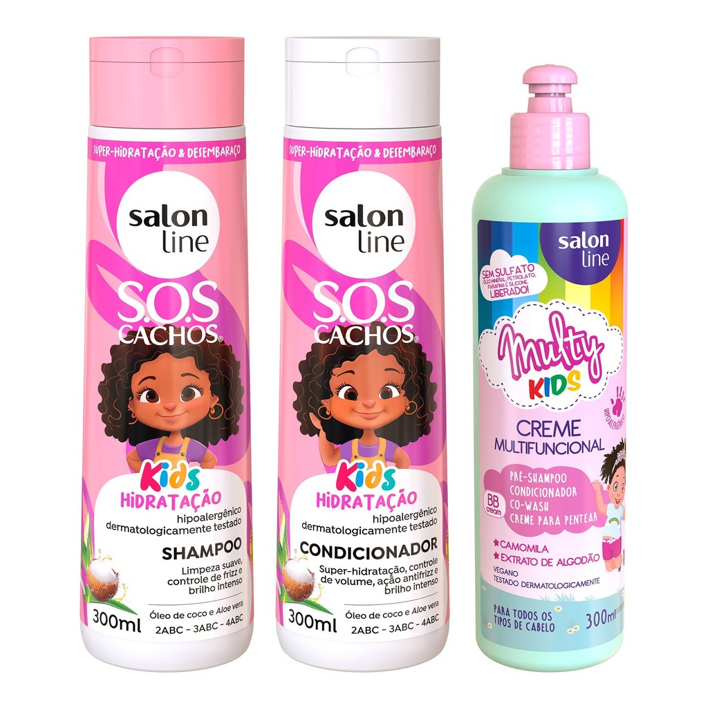 Kit Shampoo Condicionador SOS Cachos Kids Hidratação e Creme Multifuncional Multy Kids Salon Line