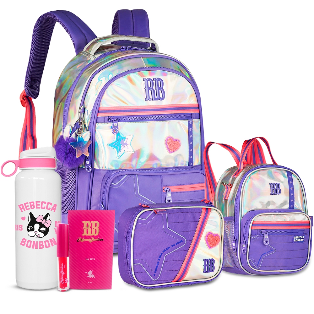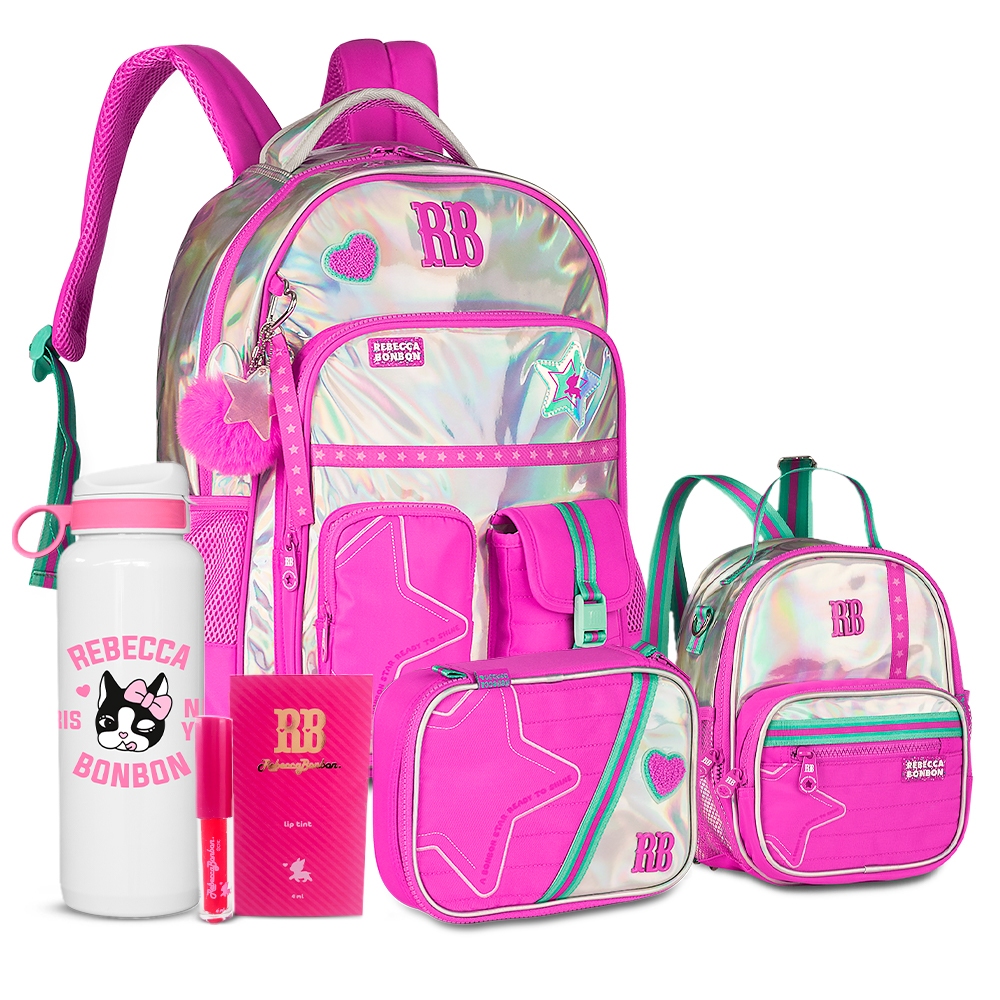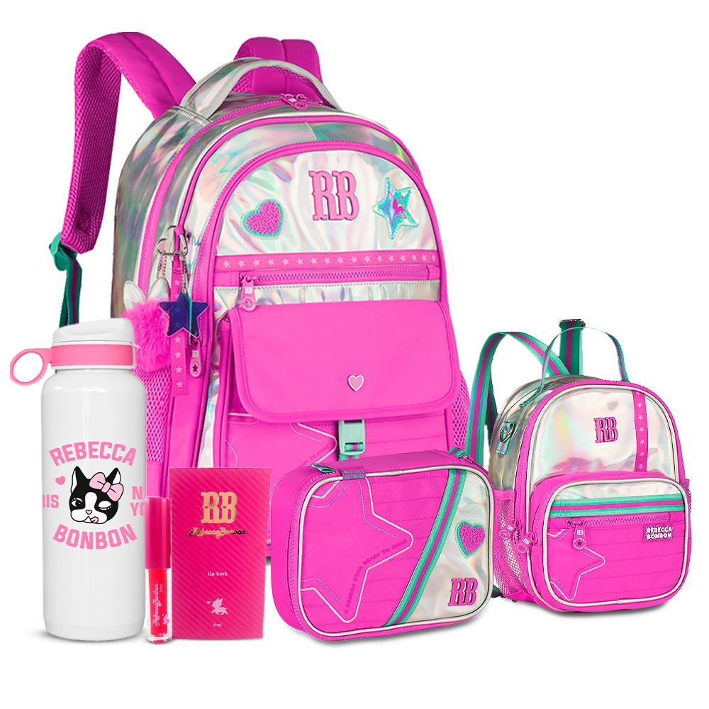 Kit Holográfico Rebecca Bonbon Completo Mochila Estojo E Lancheira Com Garrafa RB