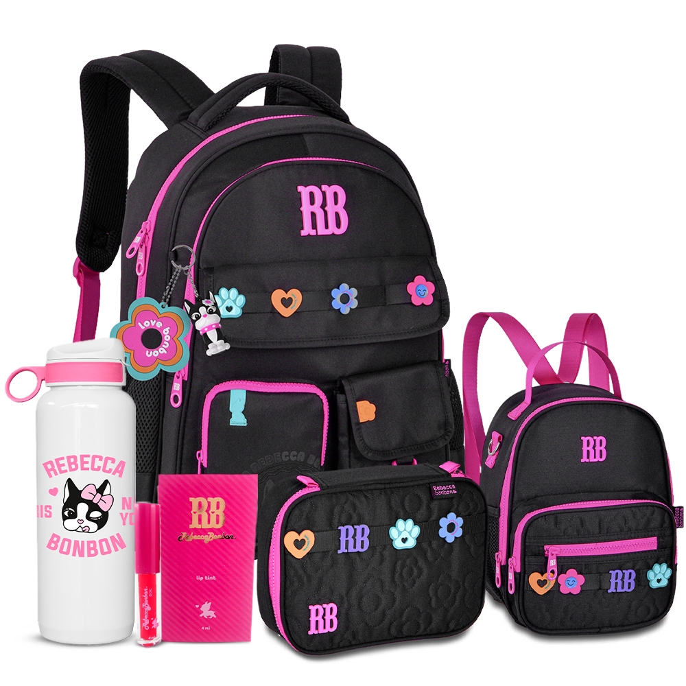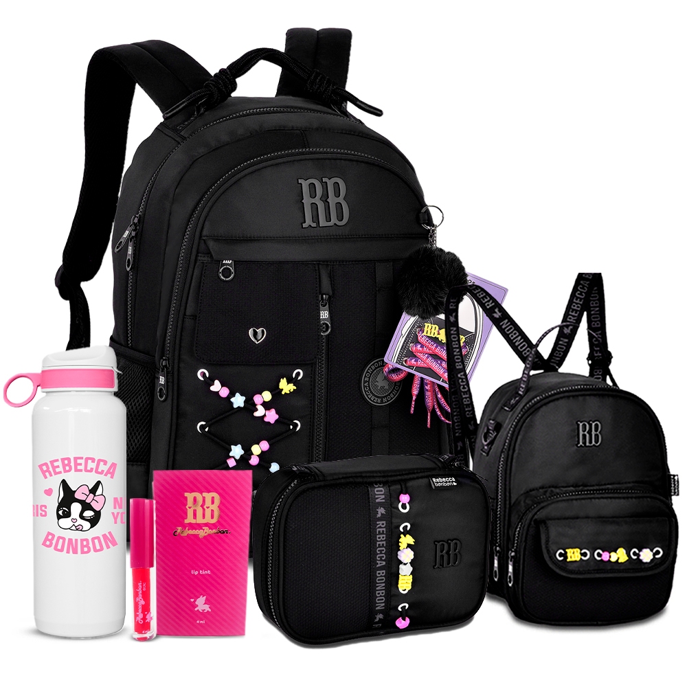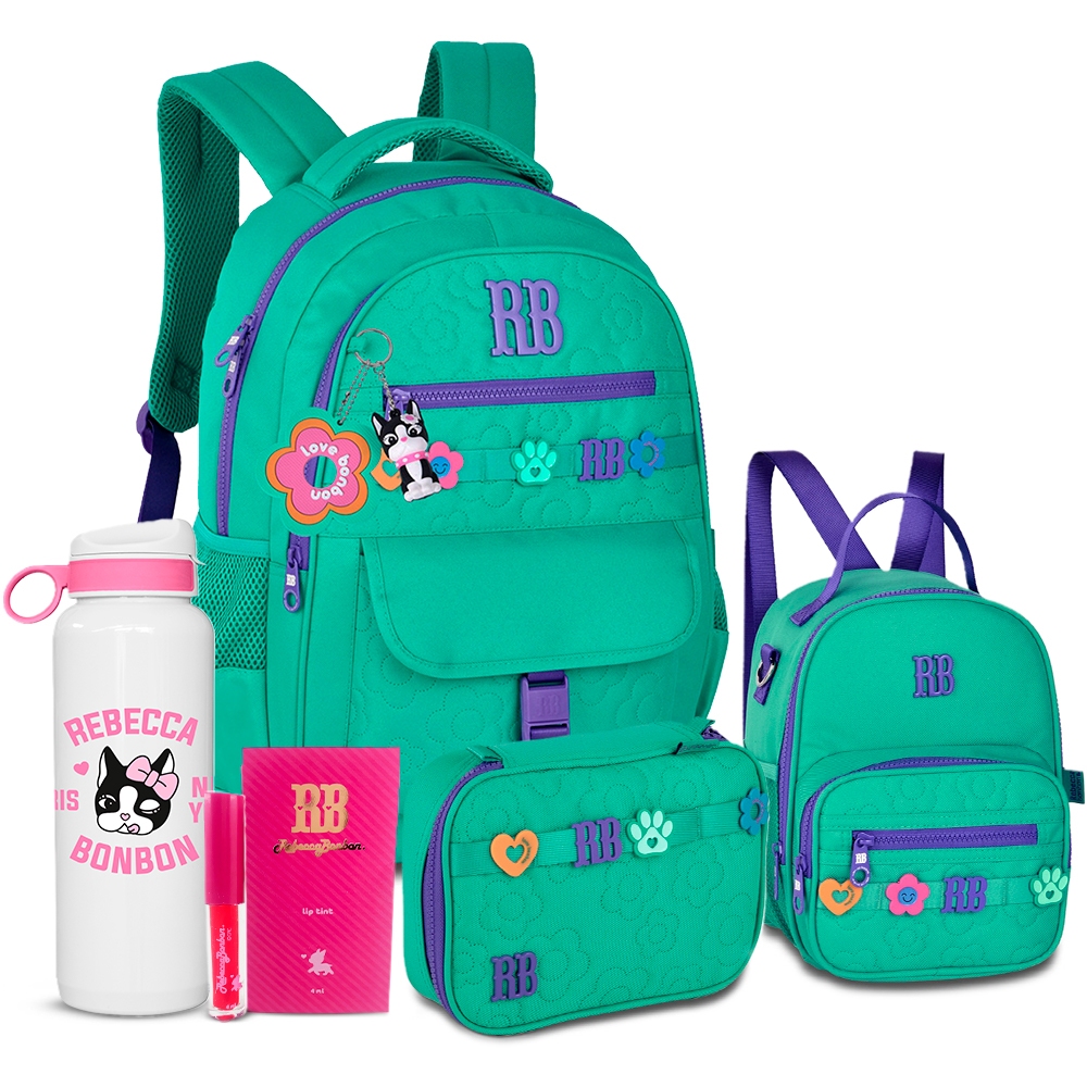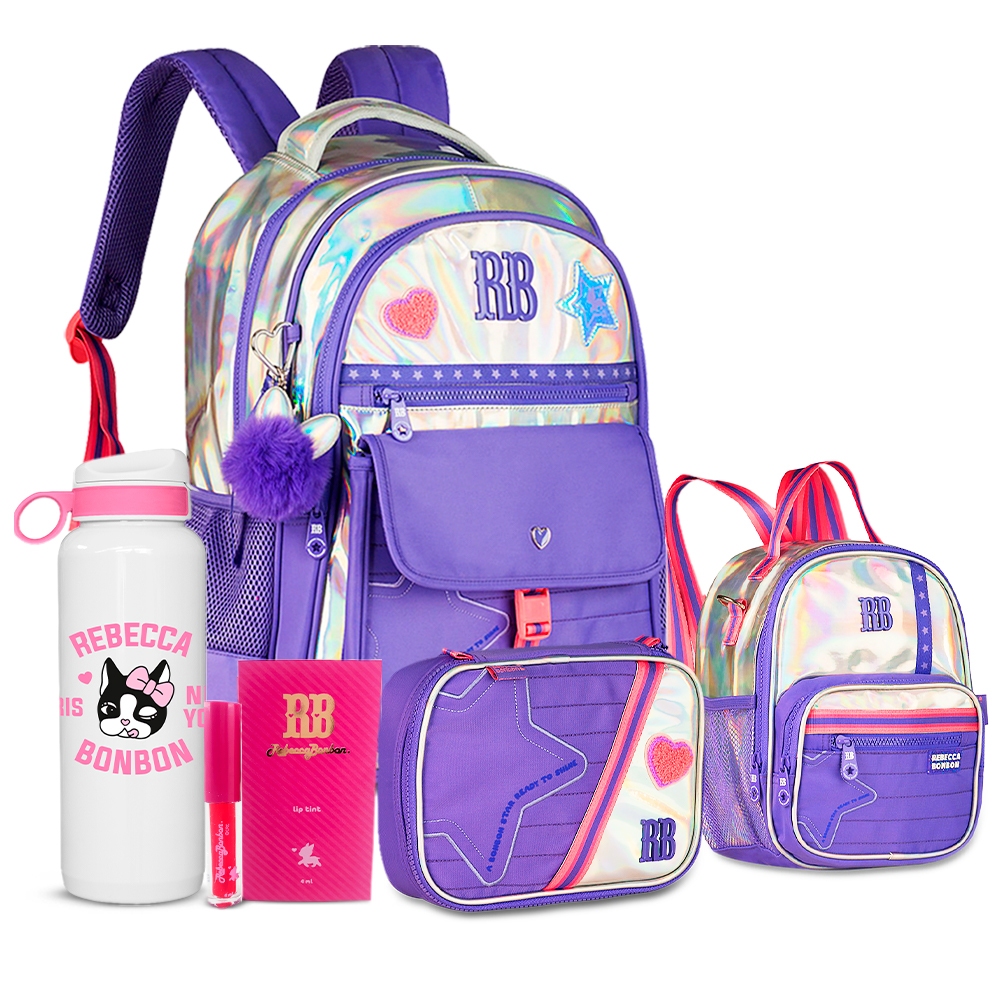Kit Holográfico Rebecca Bonbon Completo Mochila Estojo E Lancheira Com Garrafa RB