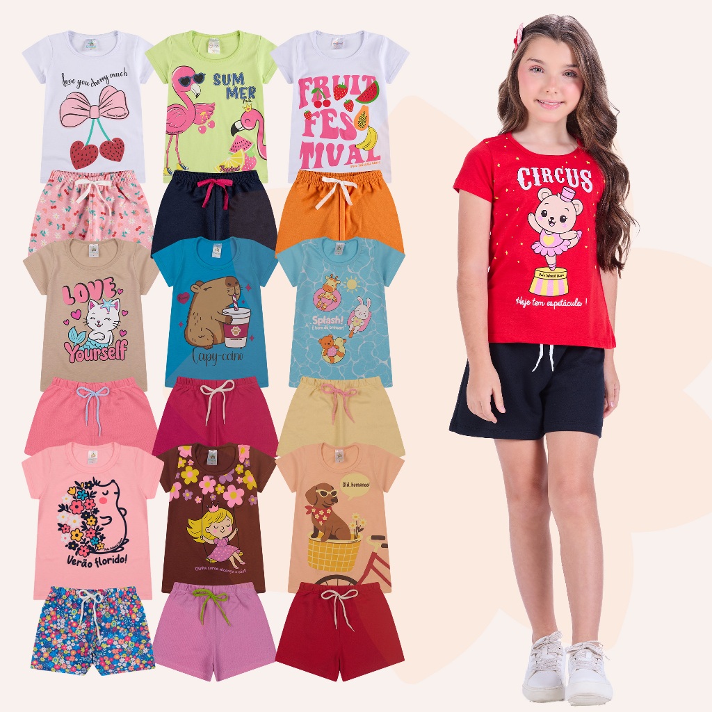 Kit Sortido 12 Peças de Roupas Juvenil Menina - 6 Camisetas + 6 Bermudas - Kit com 6 Conjunto de Verão Feminino Juvenil
