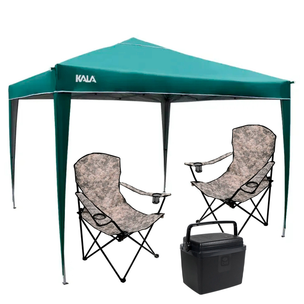 Kit Tenda Gazebo Dobrável 3x3 Metros 2 Cadeira Camuflada Dobrável 1 Cooler Preto 12 Litros