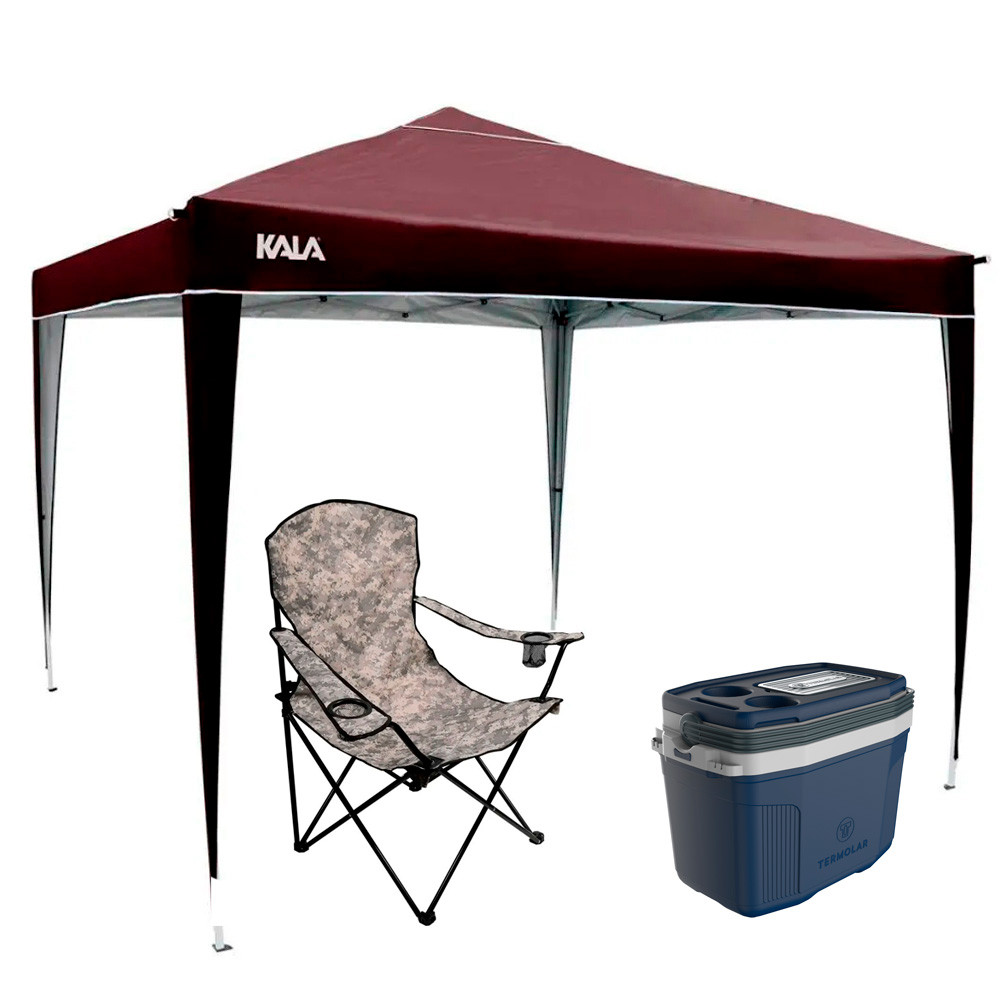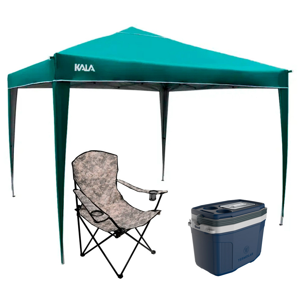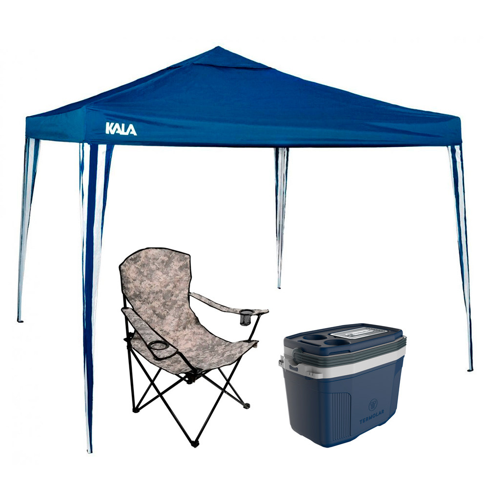 Kit Tenda Gazebo Dobrável 3x3 Metros Cadeira Camuflada Dobrável Cooler azul 20 Litros Praia Pesca