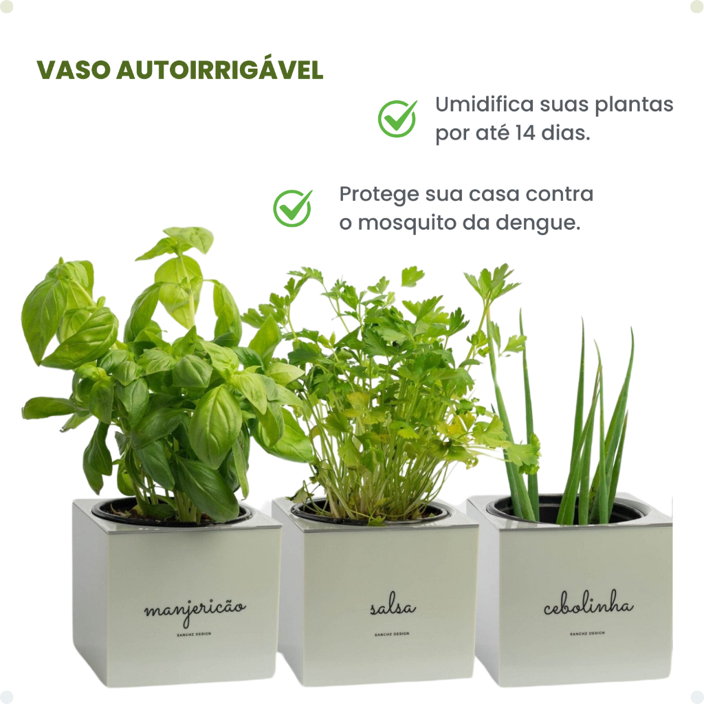 Kit Vasos Quadrados Autoirrigáveis Minha Horta Hortinha Salsa Alecrim Manjericão Cebolinha