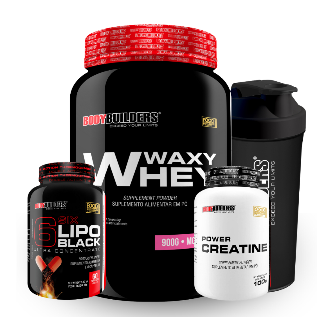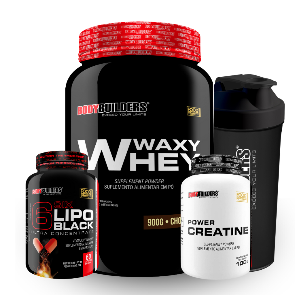 Kit Waxy Whey 900g + Power Creatina 100g + 6 Six Lipo Black 60 Cáps + Coqueteleira - Bodybuilders