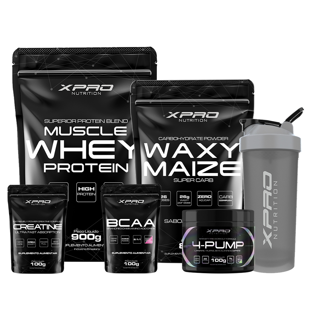 Kit Whey Muscle 900g+Waxy Maize 800g+4-Pump 100g+Creatina 100g+Bcaa 100g+Coquet 700ml- XPro Nutrition