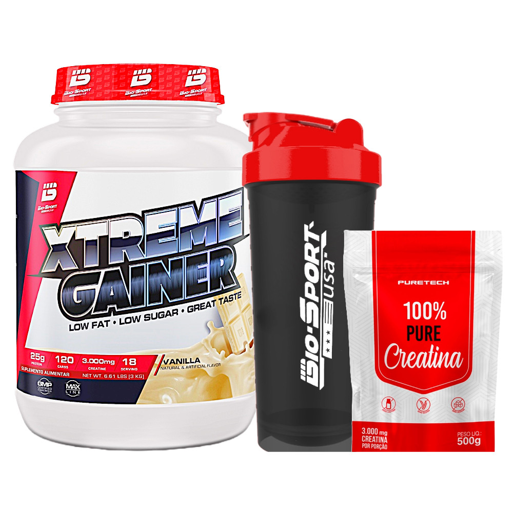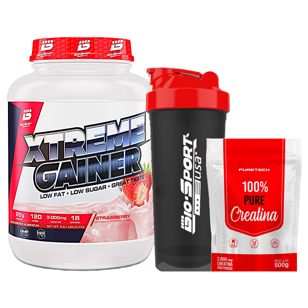 Kit Xtreme Gainer 3kg - Bio Sport + Creatina 100% Pure 500g - Puretech + Coqueteleira - Bio Sport