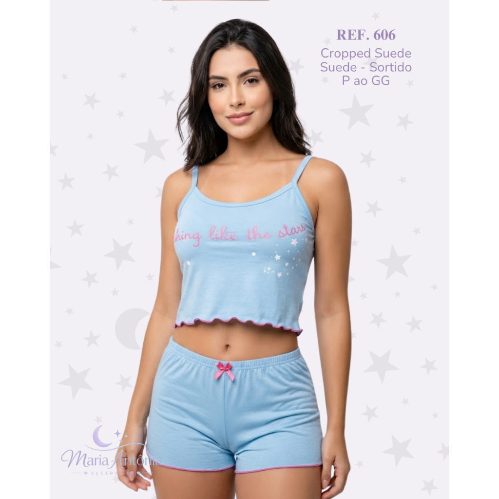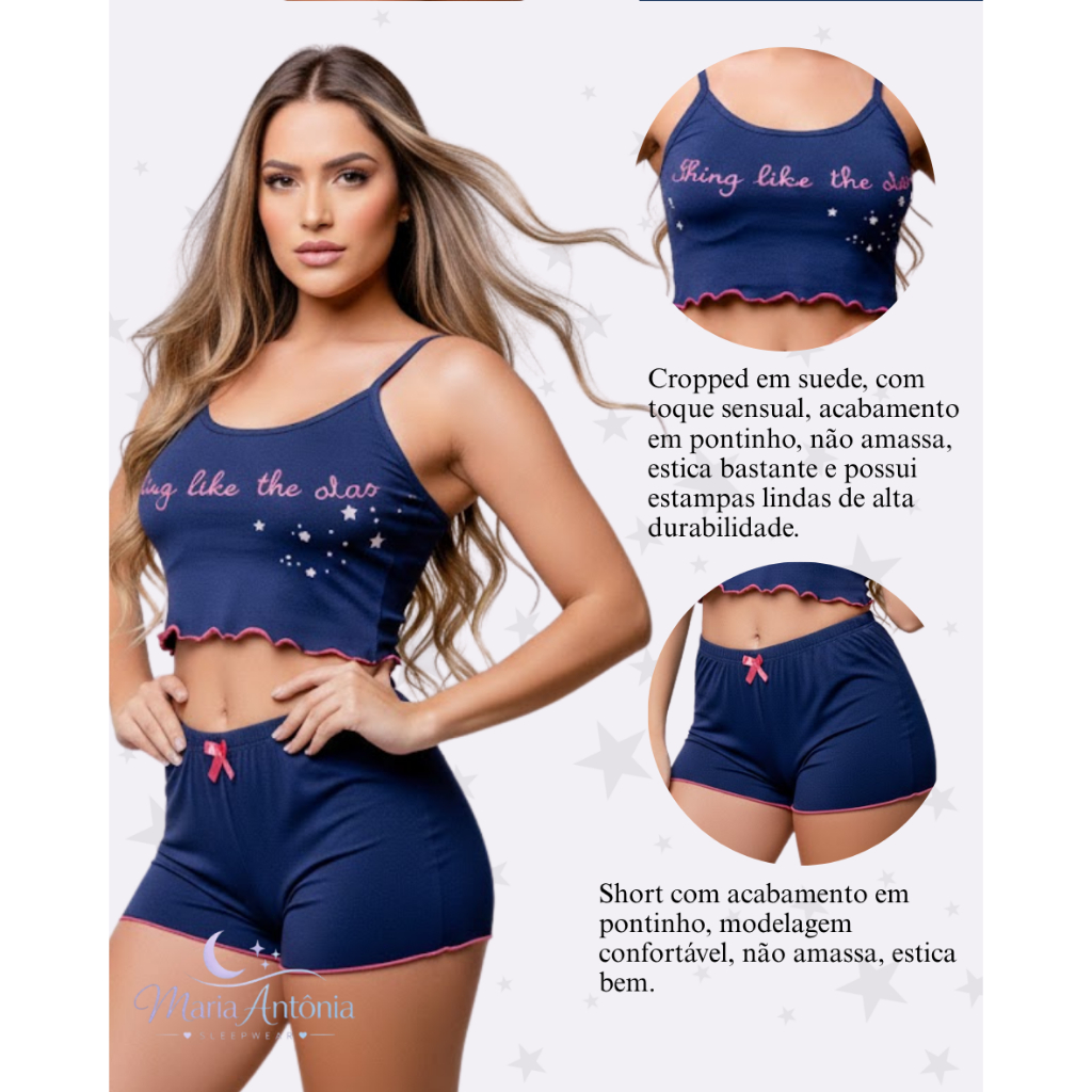 Pijama Baby Doll Virginia Suede Cropped Blusa e Short Conjunto Sortido Sensual Promoção