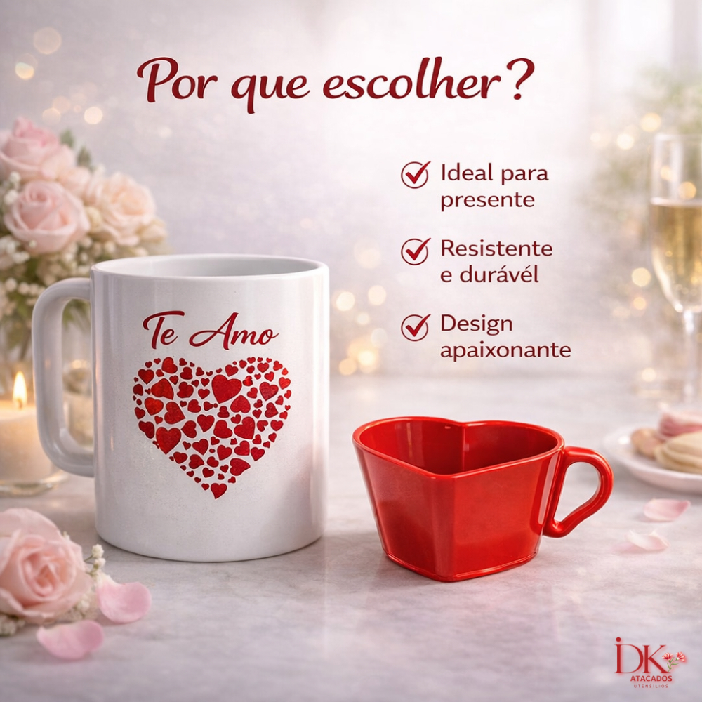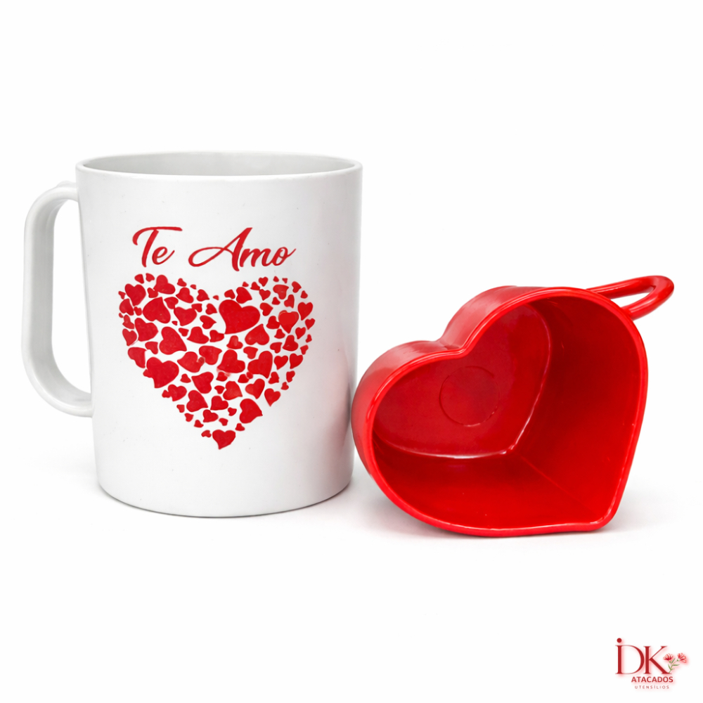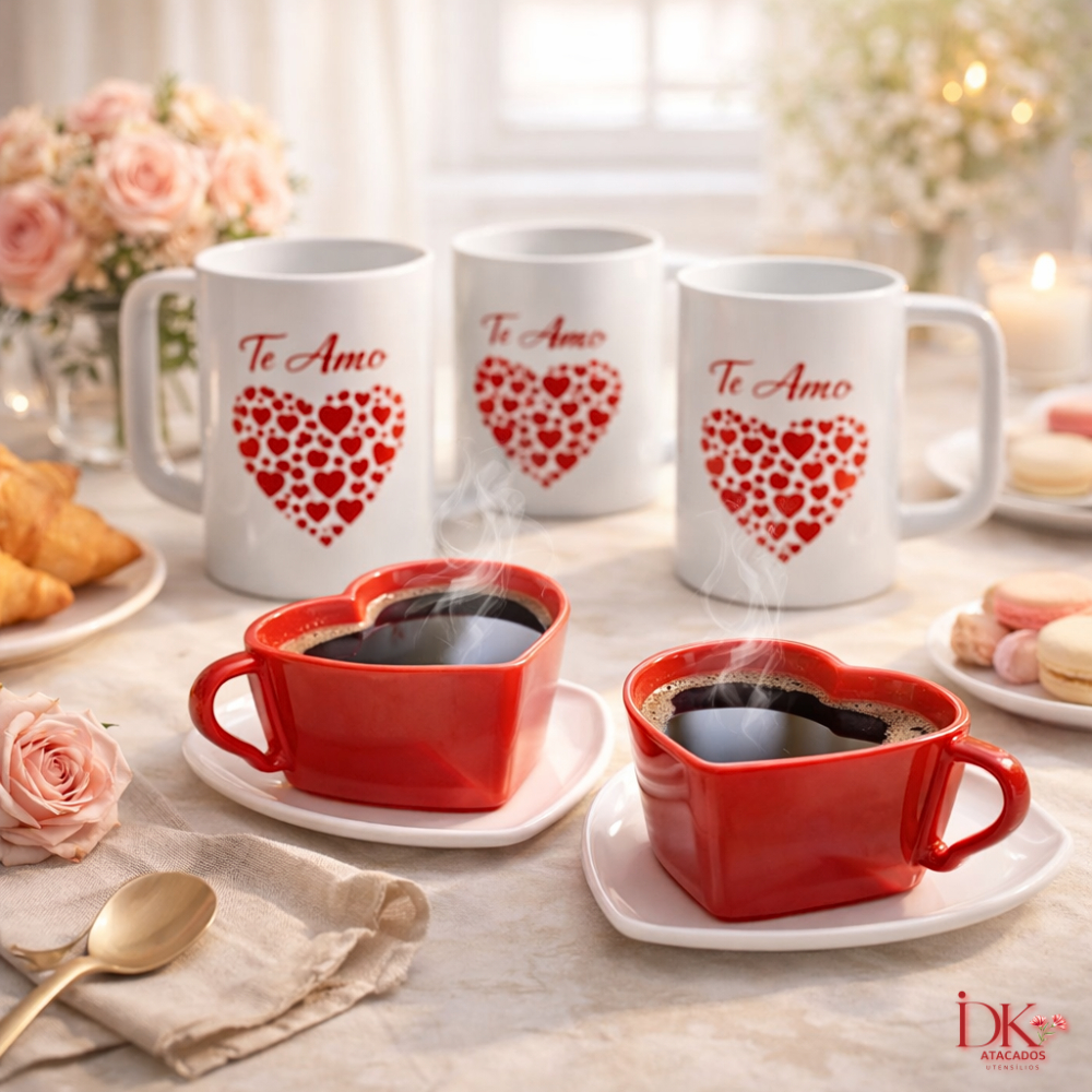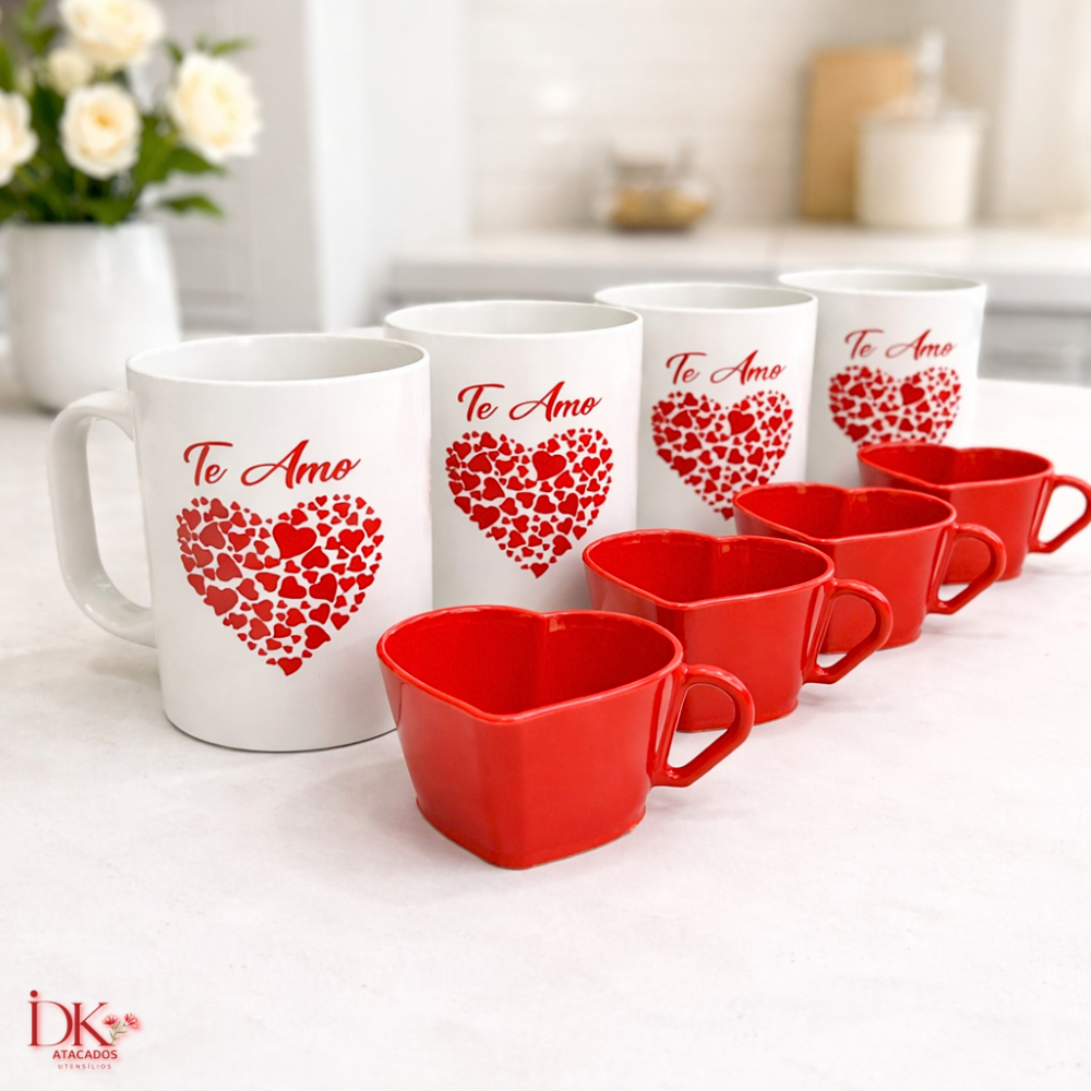 Kit Amor 8 Peças com 4 Canecas e 4 Xícaras Coração Presente Perfeito
