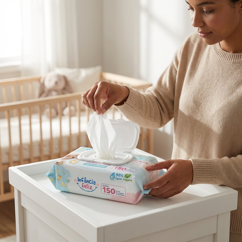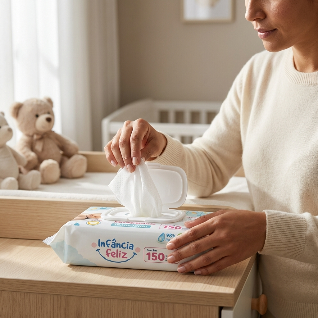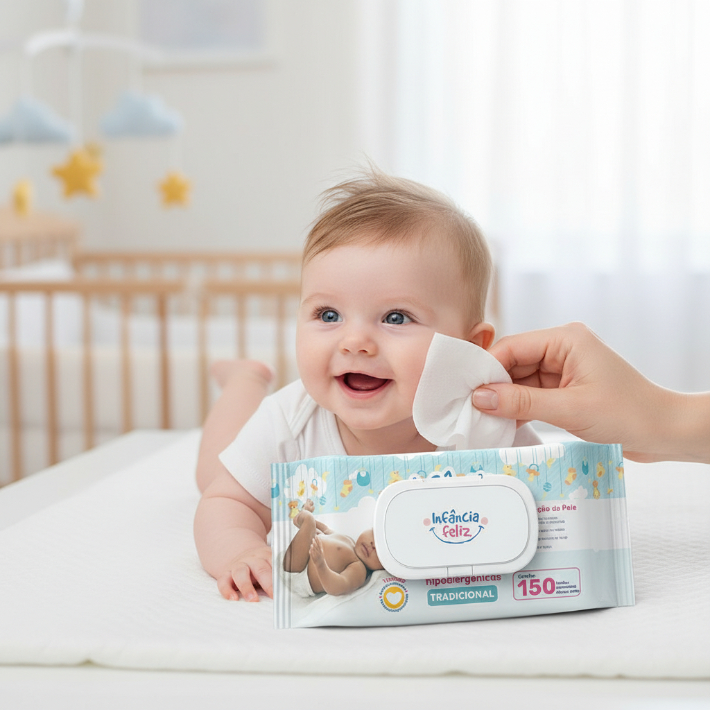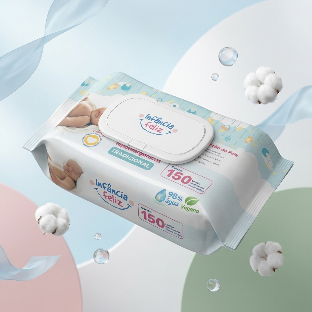 Kit com 05 Pacotes de Toalhas Umedecidas Infância Feliz - 150 folhas 20x12 cm - 98% Água - Vegana
